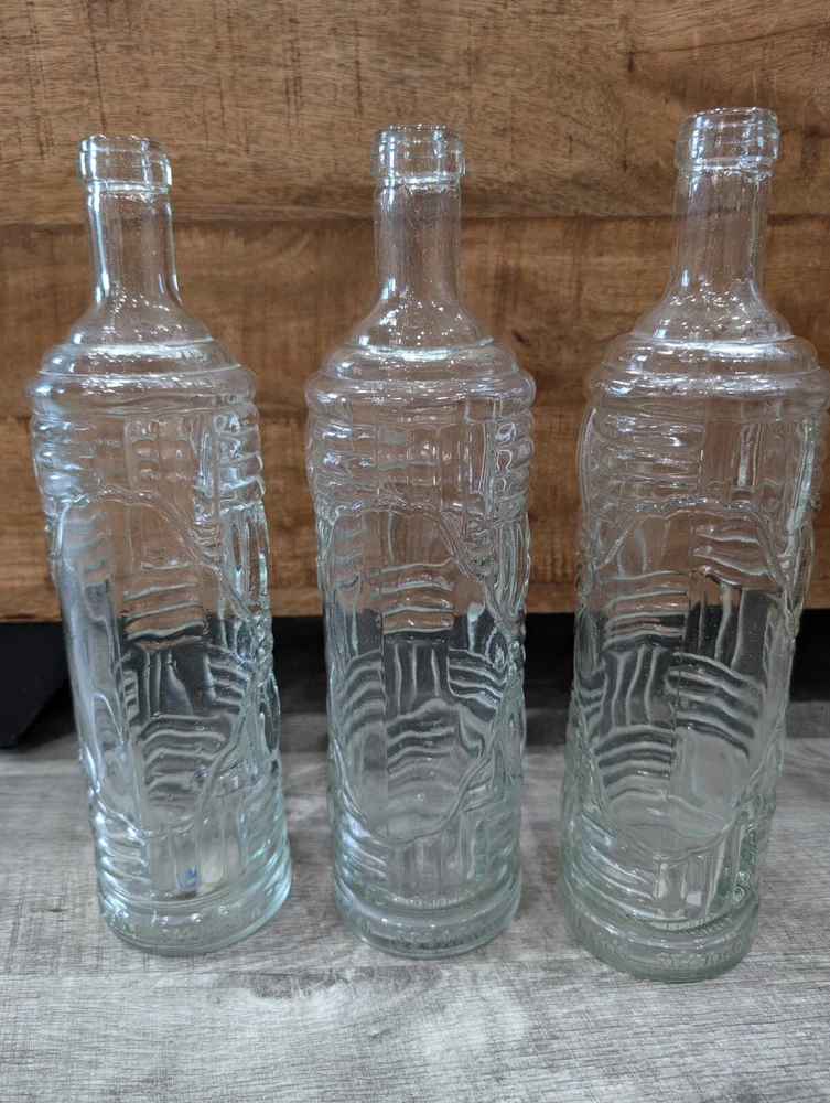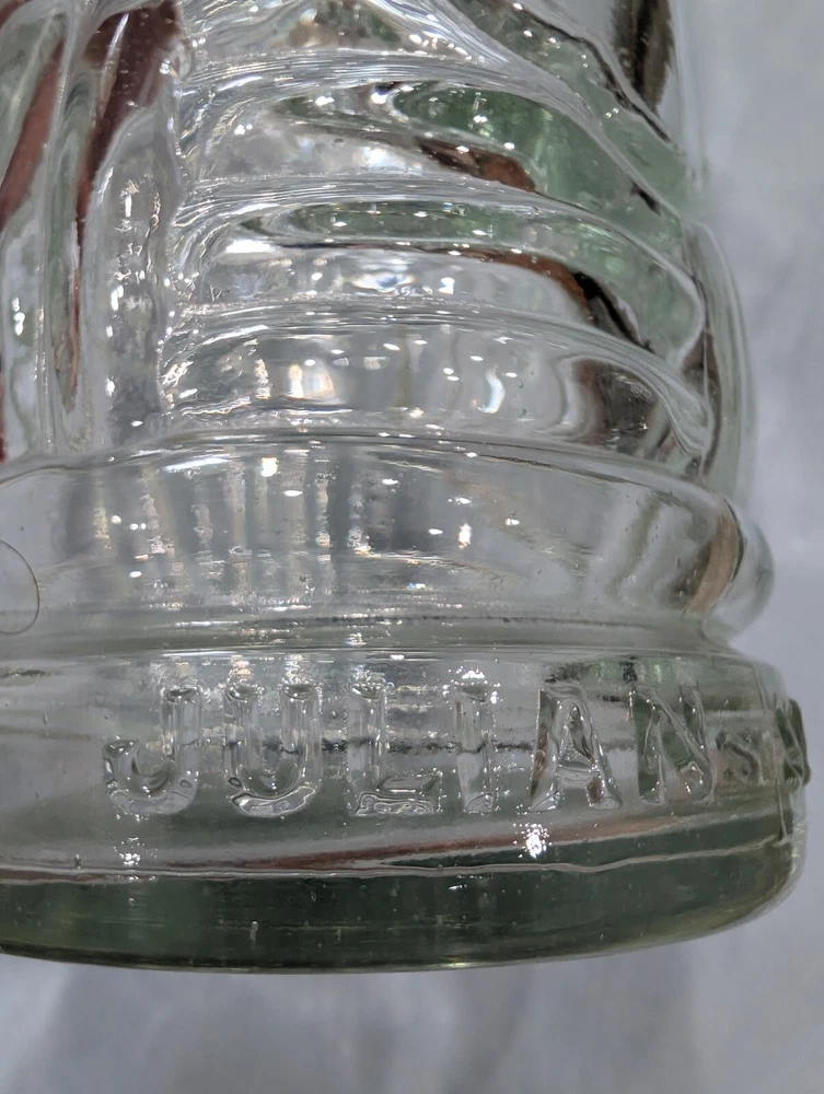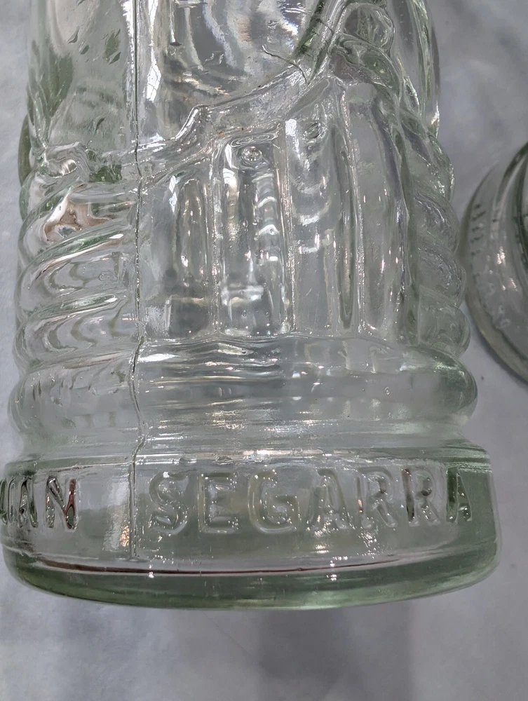 This vintage glass bottle by Julian Segarra is a unique addition to any home bar or collection. The geometric pattern and clear glass give it a contemporary style, while the decorated features add a touch of charm. Measuring at 13 inches in height, this absinthe bottle is perfect for display or use. Made in Spain, it is a high-quality piece of glassware that is sure to impress.