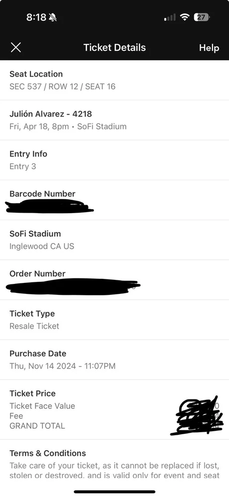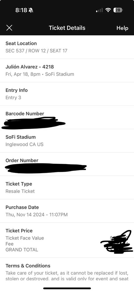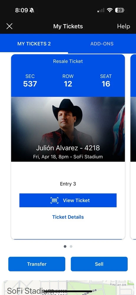 Julion Alvarez Tickets PLEASE READ CAREFULLY !!! I bought them to make sure I go… I was in line 1 hour and they sold out in less than 13 min when i got in. Im a huge fan but wont be able to make it. This event is in California… again in CALIFORNIA. @ the SoFi stadium Im only selling the tickets. Flight and stay will have to be on you. Its a good opportunity for a birthday or vacation… This transaction will not be made through phone. We will have to meet in public like Starbucks or at my job and preferably with company. You have to have the Ticketmaster app for transfer. Only serious offers.