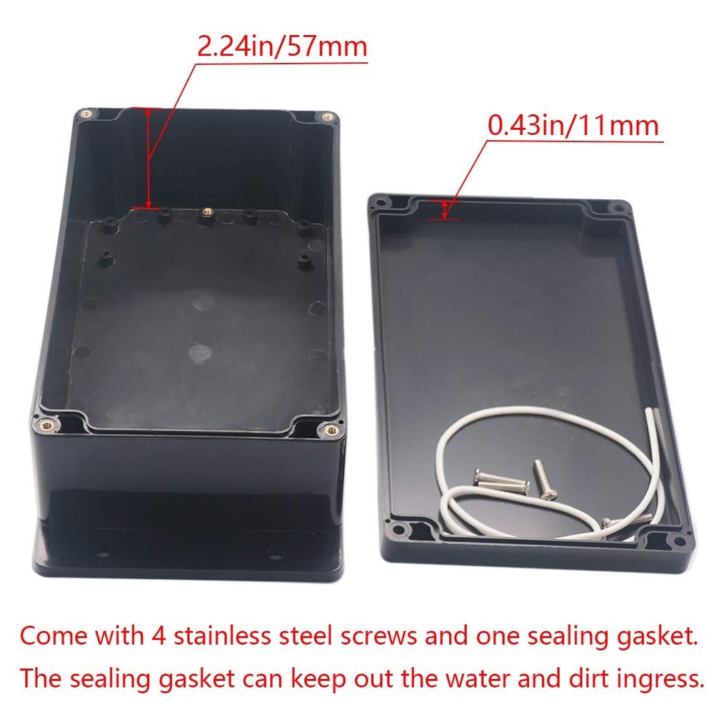 *This ABS project box brings a better customizable experience. Certain modifications can be done according to your requirements. Sealed waterproof features protect your instruments even under the adverse environment. It comes with 4 screws to close the box. * Weatherproof junction boxes, perfect for use outdoors. * junction box means these are well protected from rain and water splash back, making them perfect for joining wires inside. * Easy to install and easy to use. *Usage: connector box is mainly suitable for indoor and outdoor electrical, communications, steel smelting, oil chemical industry, electronics, electric power, railway, construction site, mining, quarry, airport, hotel, ships, large factories, terminal equipment, sewage discharge wastewater treatment, etc. Outer dimension: Approx. 7.87"x 4.72"x2.95"(200 x 120 x75 mm). Inner dimension: Approx7.52" x4.37" x 2.68" (191 x111 x68mm). Package includes: 1xBlack junction box, 4 x stainless steel screws, 1x sealing gasket ***Great Customer service: If there is any issue with your order, please contact our customer service, we will help you solve it soon*** 【Size】- Outer size of the project box: 7.87"x 4.72"x2.95"(200 x 120 x75 mm); Inner size of the project box:7.52" x4.37" x 2.68" (191 x111 x68mm) 【Superior Electrical Safety】– IP65 Rated Indoor & Outdoor Waterproof Junction Box protect against dust, corrosion and splashing water, helps keep all your home electrical equipment Clean & Dry. 【Superior Durable】- Made of high-quality ABS material that offers outstanding impact resistant and electrical insulation, Moisture-proof, sunscreen, anti-corrosion, durable for years use. can keep your equipment well-protected in harsh environments. 【Easy for DIY】- This sturdy junction box can be drilled and shaped easily without cracking, so it’s also suitable for your various DIY projects. 【Wild Application】Widely used for electronic projects, instrument enclosure, power supply units, temperature controller box, etc.****Package Content : 1xWaterproof Junction Box****