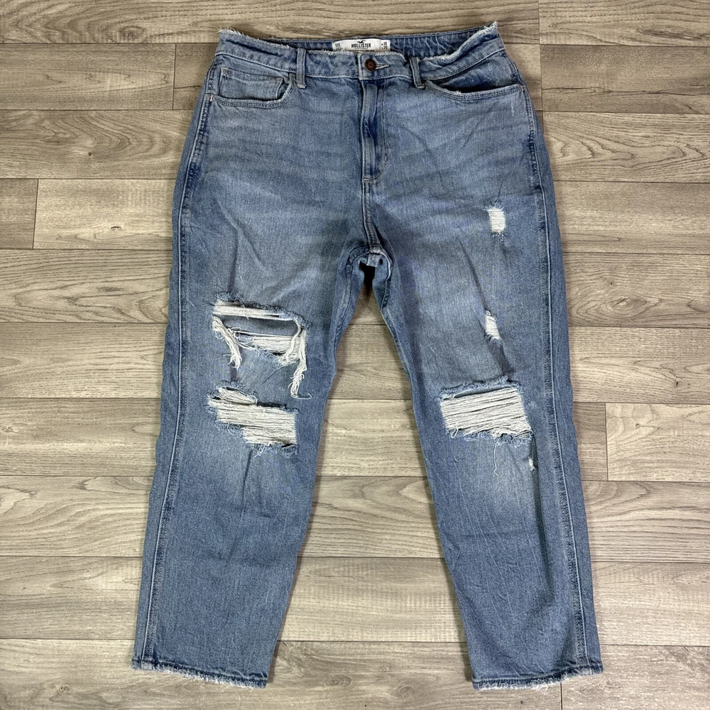 Junior's Hollister Denim Jeans sz 11 Short -Style: Curvy High Rise Mom Jean with Hollister Vintage Stretch -Straight Leg Opening -Color: Light denim wash -Ripped / Destroyed throughout the jeans -High Rise with 12.5" rise -5 pocket styling -98% cotton and 2% elastane -Great Condition! Flat Measurements: 16" Waist plus stretch 12.5" Rise 23.5" Inseam 6.5" Leg Opening I take very good care of my items in my smoke free home! If you have any questions, please contact me and I'll be more happy to answer! Please check out my other listings and Thanks for looking!% cot