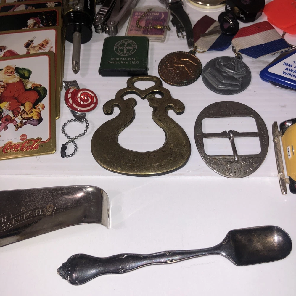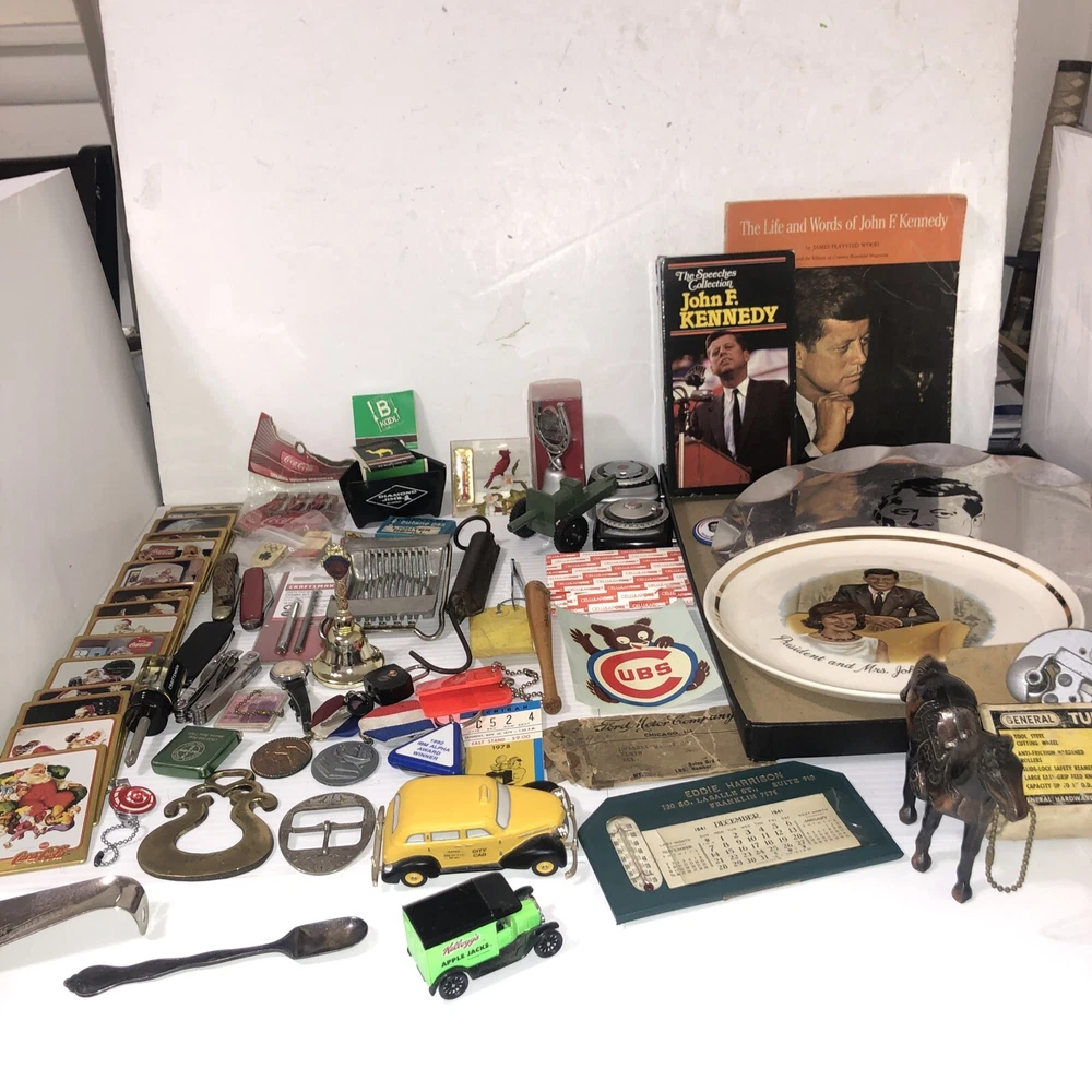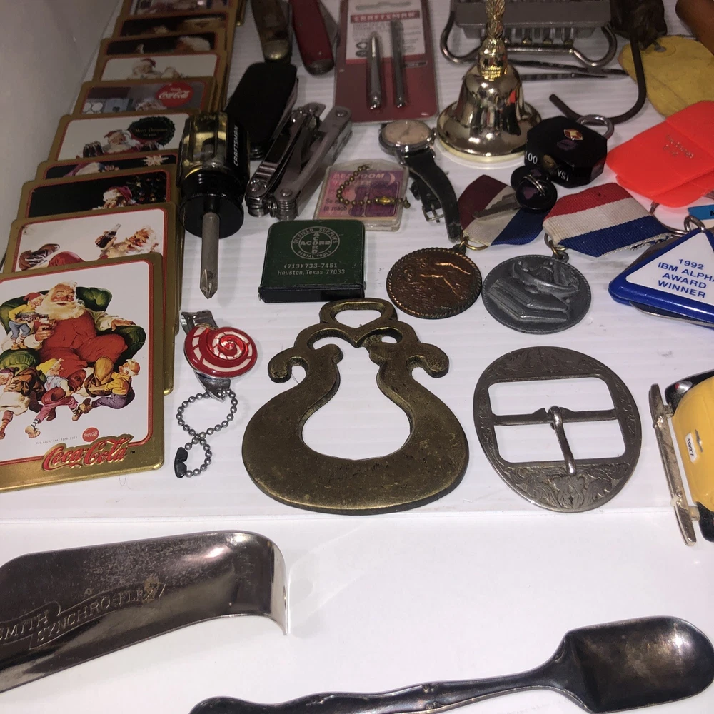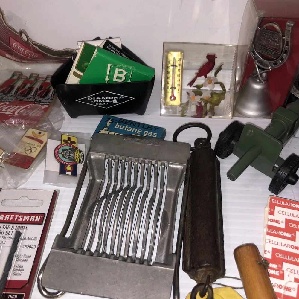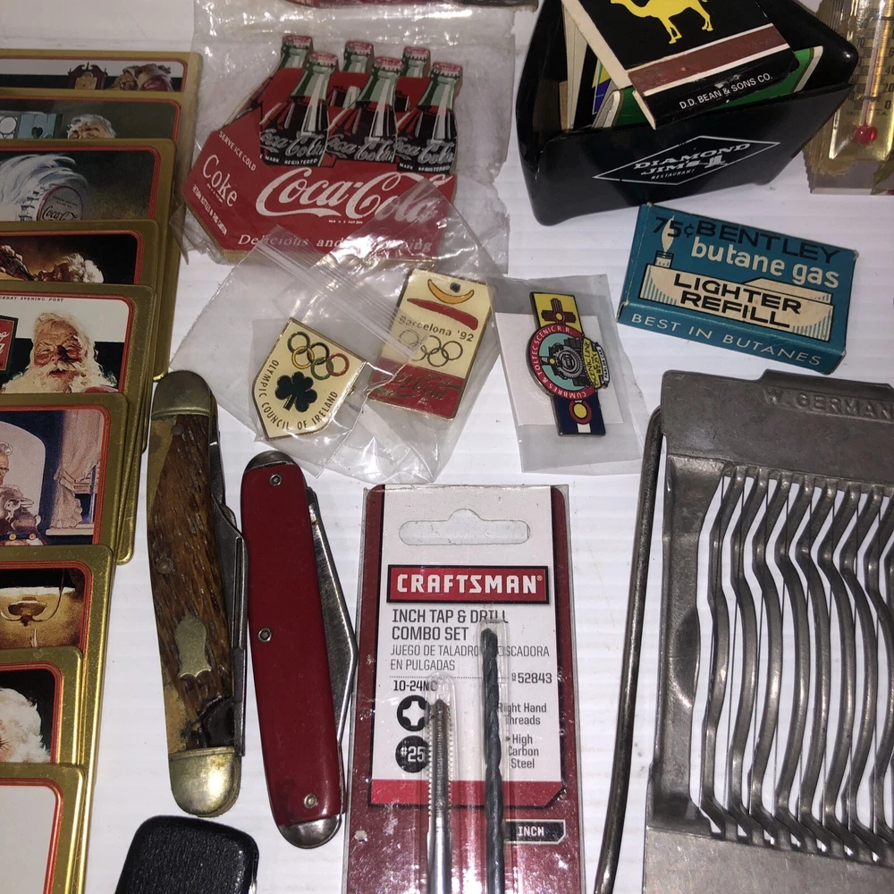 This Junk Drawer Lot of Mixed Vintage Grandpa Items, Politico, and Coca-cola Rare is a must-have for any collector. The lot includes a variety of unique items that will make a great addition to any collection. The Politico items are particularly rare and hard to find, making them a valuable addition to any collection. The Coca-cola items are also hard to find and are sure to be a conversation starter. The grandpa items are perfect for those who love vintage items and want to add some character to their collection.
