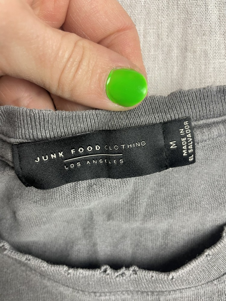 Personalize:NoSeller Notes:“The item has distressed neck and faded graphics on the front.”Country of Origin:El SalvadorType:T-ShirtSleeve Length:Short SleeveNeckline:Crew NeckSize:MDepartment:MenPattern:Graphic PrintColor:GrayVintage:NoSize Type:RegularHandmade:NoFabric Type:JerseyCharacter:Mickey MouseFit:RegularTheme:Cartoon, OutdoorBrand:Junk FoodCharacter Family:DisneyFeatures:Lightweight