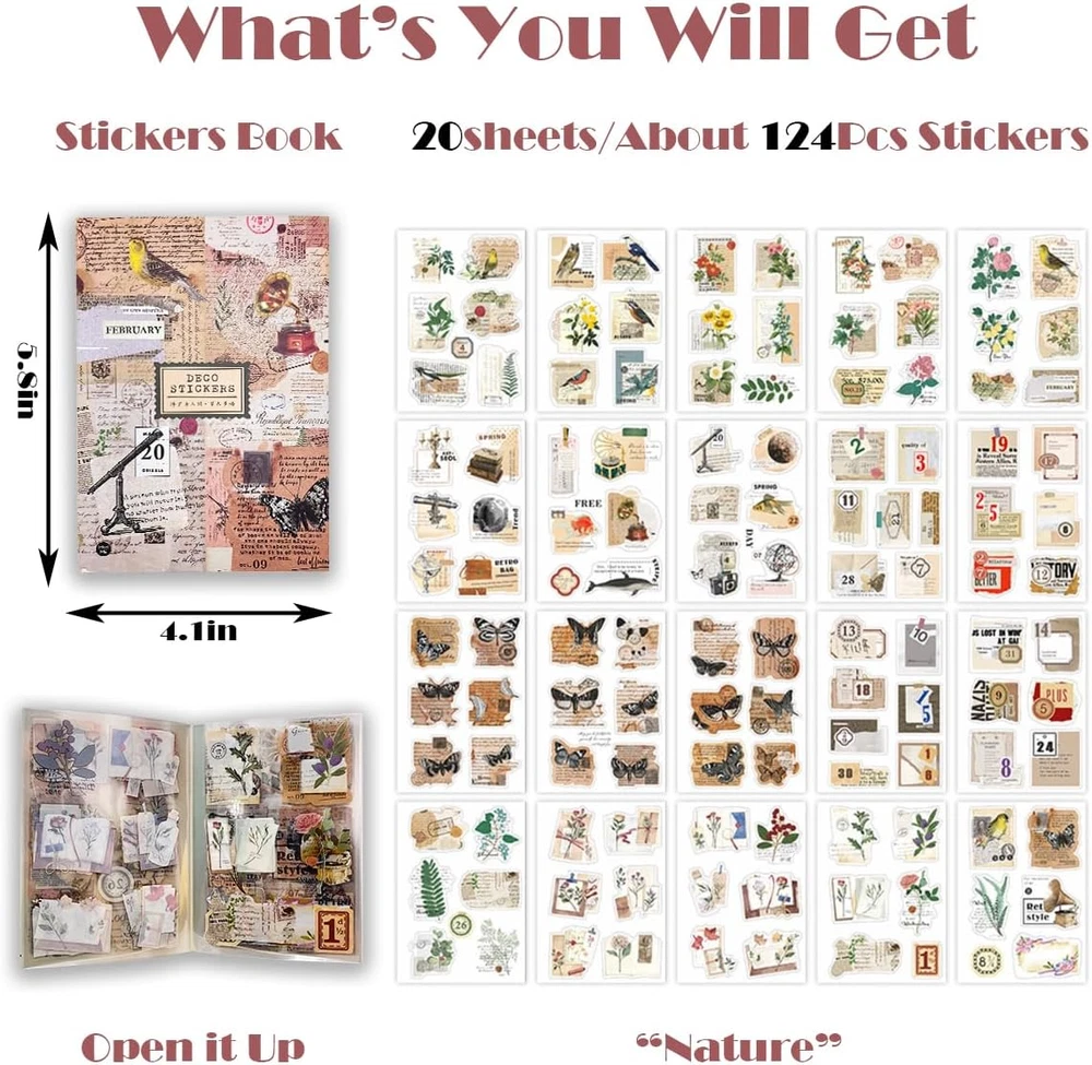 【Rich Patterns & No Repetition】—— The package including 20 sheets Waterproof transparent stickers, each sheet has 6pcs patterns, 120 PCS STICKERS/BOOK. There have 4 styles for you to choose: 1. Nature; 2. Poem; 3. Stamp; 4. Letter. These gorgeous stickers will surely be a great accent in your projects. 【Unique Design & Widely Applicable】—— These lovely stickers are sticky and will hold well on smooth and dry surfaces like journals, calendars, stationery, furniture, books, phone case and water bottles. They’re highly durable, easy to peel off and water resistant. 【Perfect Size of Stickers】—— The size of each quotes sticker are vary from 4 to 6 cm. A perfect size for bag, notebook and gifts decor. You can use them to decorate different gifts or crafts according to your needs; Different positive quotes are designed to show your personality and make your life full of color. 【High Quality Stickers】—— All the inspiring stickers are made of premium PET material with matte finishing and transparent clear border and can be applied to any clean and smooth surfaces, not easy to fall off. Bright, vibrant, beautiful,easy to use and not easy to fade. 【Beautiful Aesthetic Stickers】—— With a nice vintage inspired look and feel, these stickers are digitally designed by hand, and packaged with love. They’re the perfect addition to your personal belongings and also make thoughtful gifts for journal amateur, students, anniversary, birthday and holidays, etc. Product Description