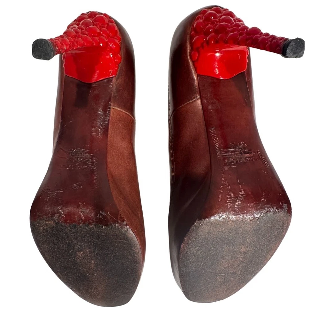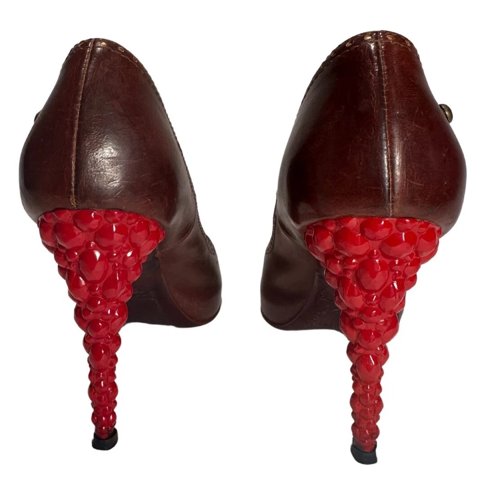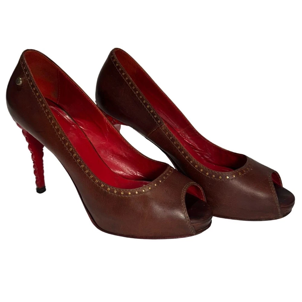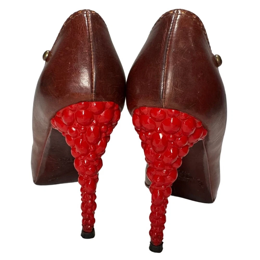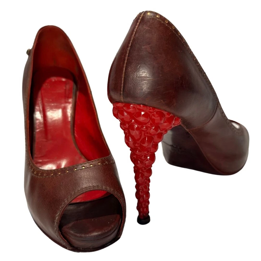 Just Cavalli Brown Leather Peep Toe Heels with Red Bubble Heel – Unique & Eye-Catching Design - Size 37 1/2 Step into luxury and make a statement with these stunning Just Cavalli high heels . Crafted from rich brown leather , these shoes feature a peep toe design and intricate gold-painted dot accents along the edges for subtle detail. The most striking feature? The vibrant red sculptural heel , designed to resemble a cluster of bubbles or gemstones. Made from glossy, durable material, this avant-garde heel adds an artistic, bold touch that sets these shoes apart from the ordinary. Perfect for collectors, fashion lovers, or anyone who wants to stand out at an event! Details: • Brand: Just Cavalli • Color: Brown (Upper), Red (Heel) • Material: Leather Upper, Glossy Red Heel • Style: Peep Toe, Statement Heel • Heel Height: 4 Inches *. Platform Height: 1/2 Inch • Size: 37 1/2 • Condition: Pre-Owned – Good condition Why You’ll Love Them: ✔ Unique sculptural red bubble heel ✔ High-quality leather with gold accent details ✔ Bold yet versatile—perfect for evening wear or making a statement Don’t miss out on owning this rare designer piece!