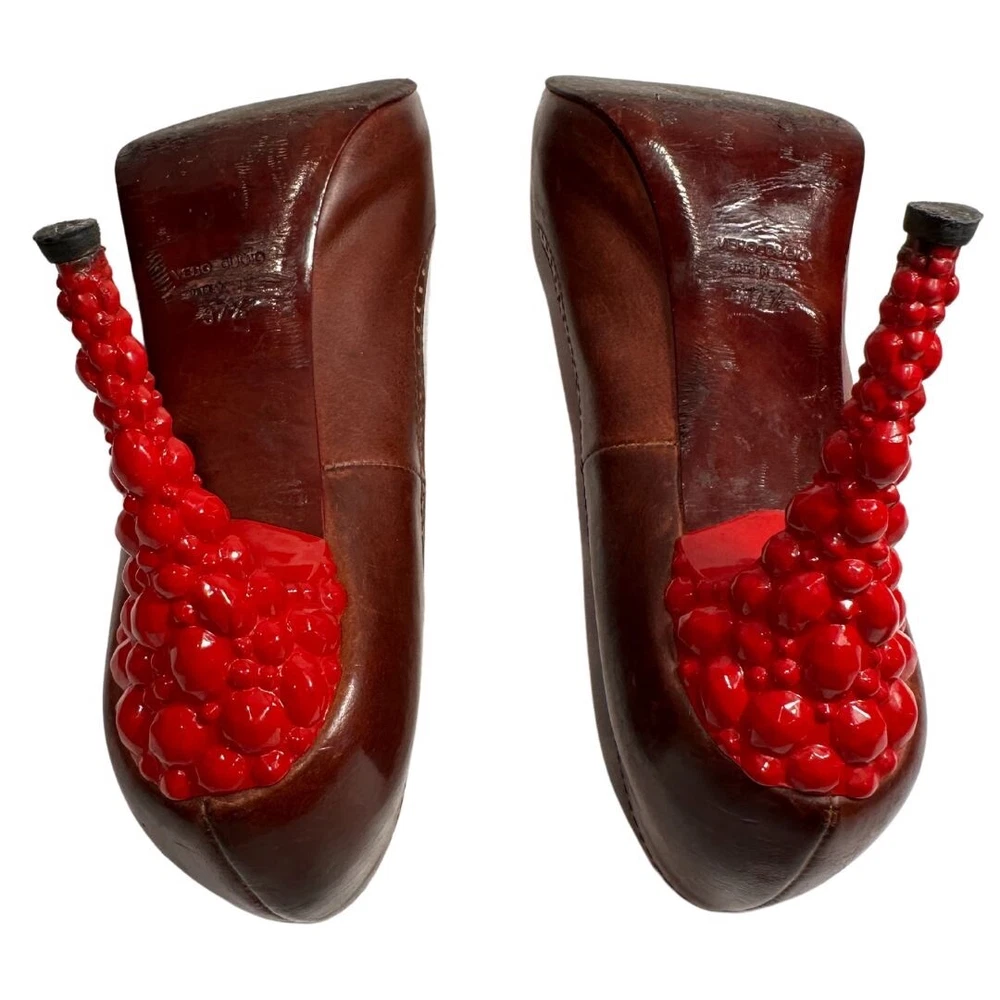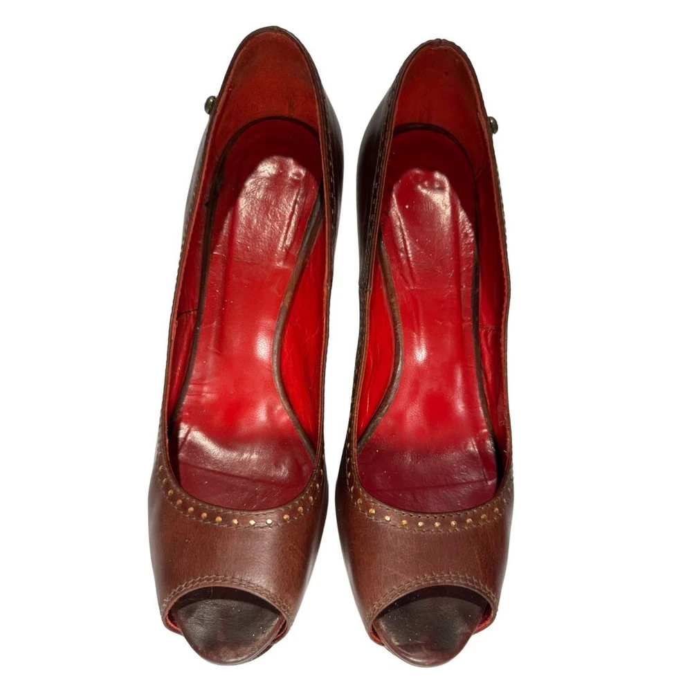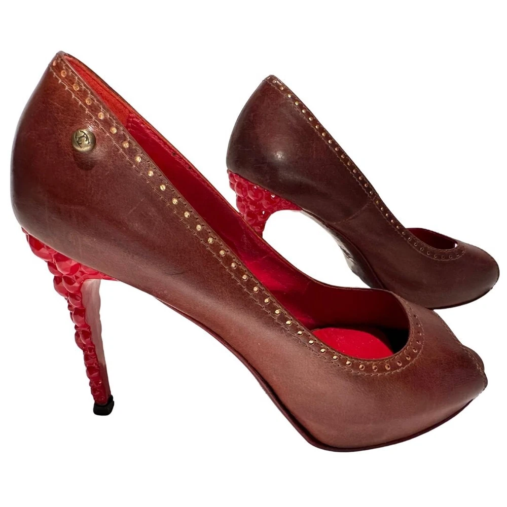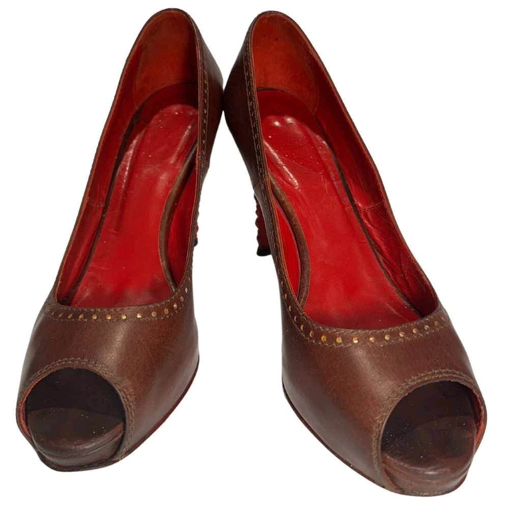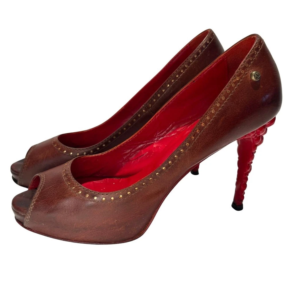 Just Cavalli Brown Leather Peep Toe Heels with Red Bubble Heel – Unique & Eye-Catching Design - Size 37 1/2 Step into luxury and make a statement with these stunning Just Cavalli high heels . Crafted from rich brown leather , these shoes feature a peep toe design and intricate gold-painted dot accents along the edges for subtle detail. The most striking feature? The vibrant red sculptural heel , designed to resemble a cluster of bubbles or gemstones. Made from glossy, durable material, this avant-garde heel adds an artistic, bold touch that sets these shoes apart from the ordinary. Perfect for collectors, fashion lovers, or anyone who wants to stand out at an event! Details: • Brand: Just Cavalli • Color: Brown (Upper), Red (Heel) • Material: Leather Upper, Glossy Red Heel • Style: Peep Toe, Statement Heel • Heel Height: 4 Inches *. Platform Height: 1/2 Inch • Size: 37 1/2 • Condition: Pre-Owned – Good condition Why You’ll Love Them: ✔ Unique sculptural red bubble heel ✔ High-quality leather with gold accent details ✔ Bold yet versatile—perfect for evening wear or making a statement Don’t miss out on owning this rare designer piece!