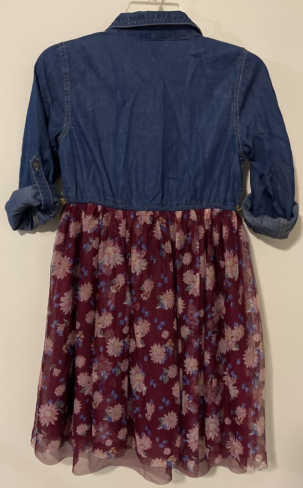 Justice, Girls, Size 12, Blue and Burgundy, Floral, Knee-Length, Dress! A2755. This is a beautiful stylish dress in excellent condition!! The material is made of cotton, lyocell, and polyester. The length from shoulder to hem is 33 inches. The lower part of the dress is layered and flowy. The sleeves are long, but can be buttoned up to 3/4 sleeves.