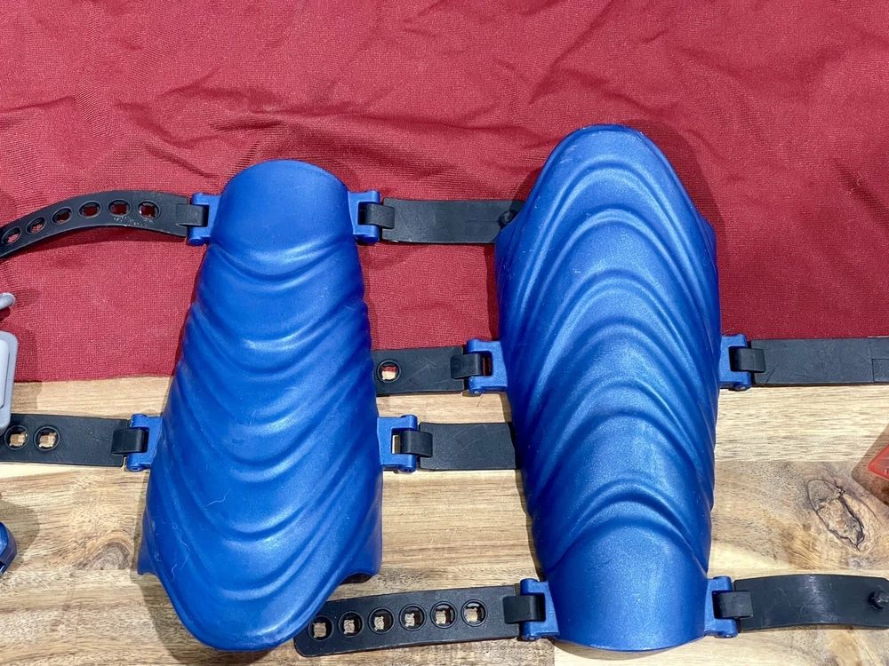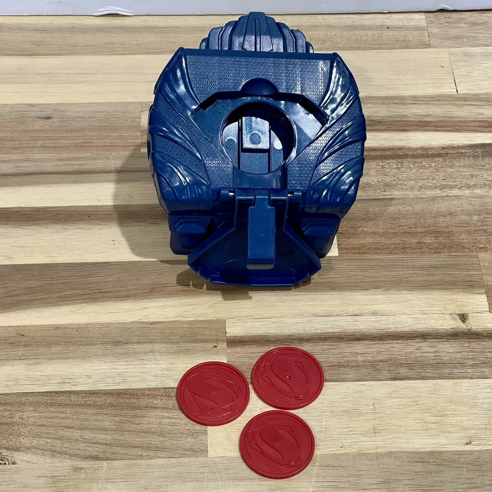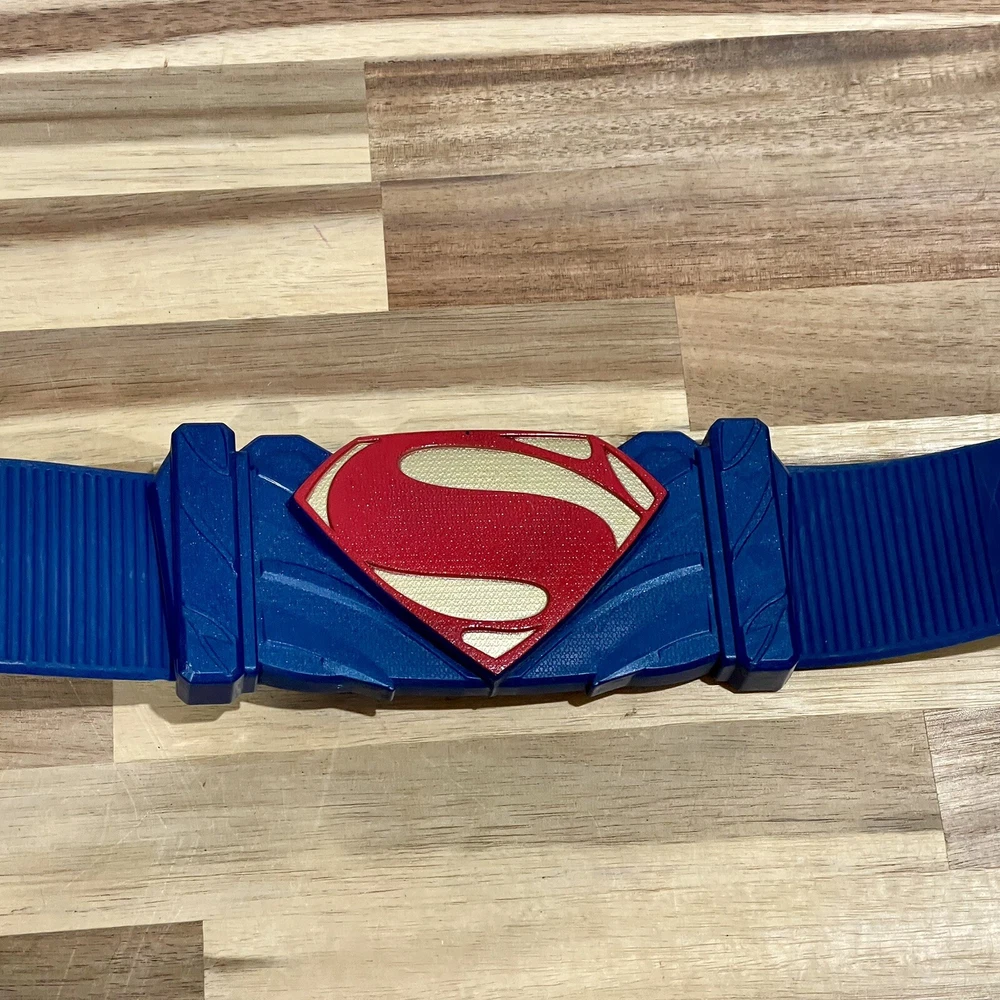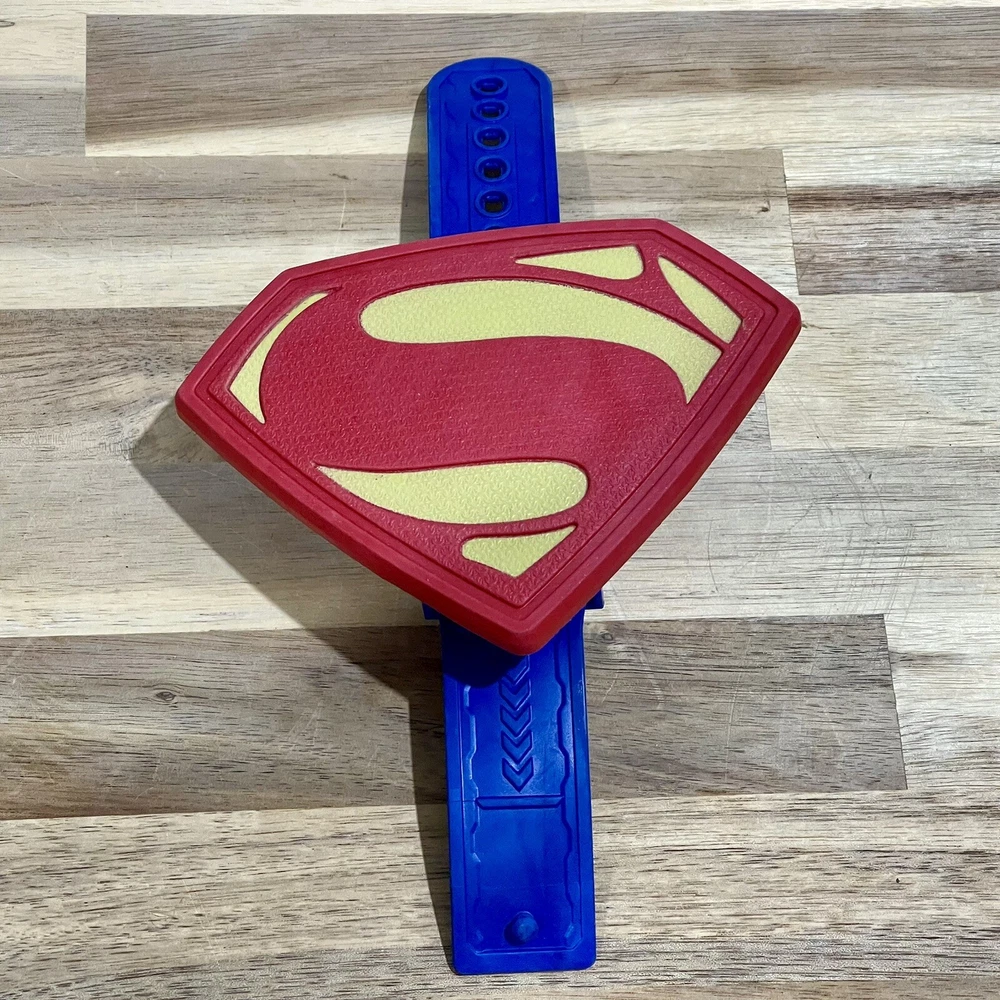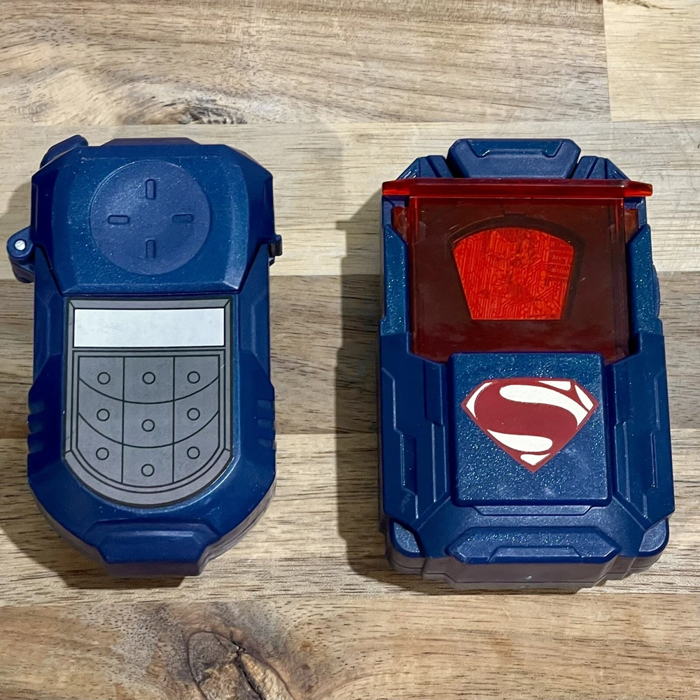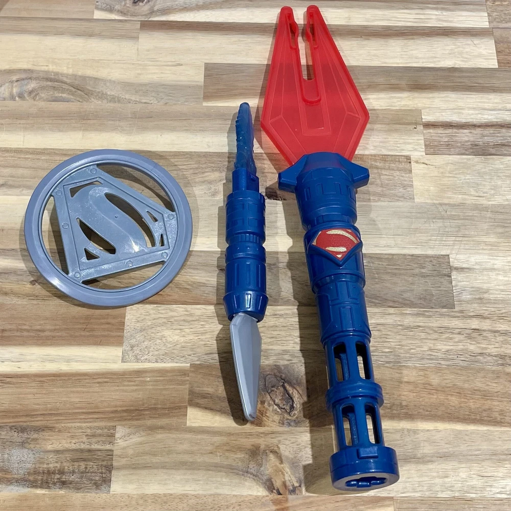 Huge lot of Superman Toys & Costume Accessories from Warner Bros. Justice League. Includes Chest armor with cape, flip up glasses, secret decoder, phone with secret compartment, wrist armor, watch with clip on Superman symbol, adjustable belt, handcuffs, spear launcher with crystal toy, & disc shooting hand blaster with 3 discs.