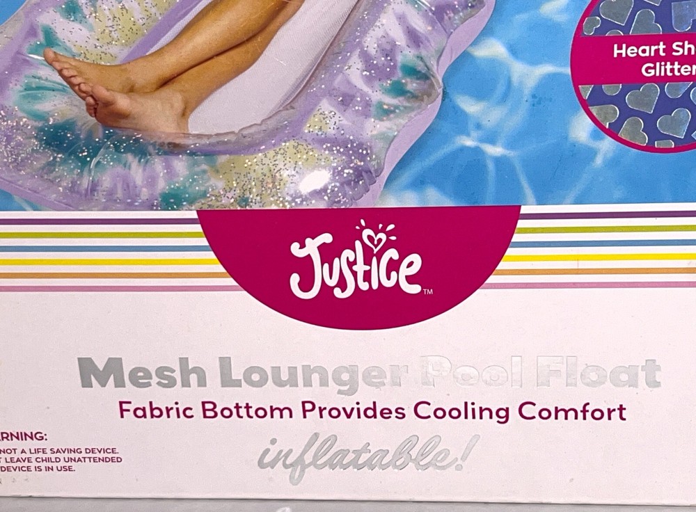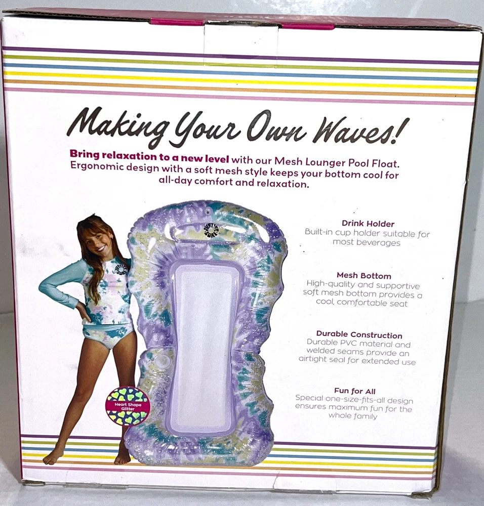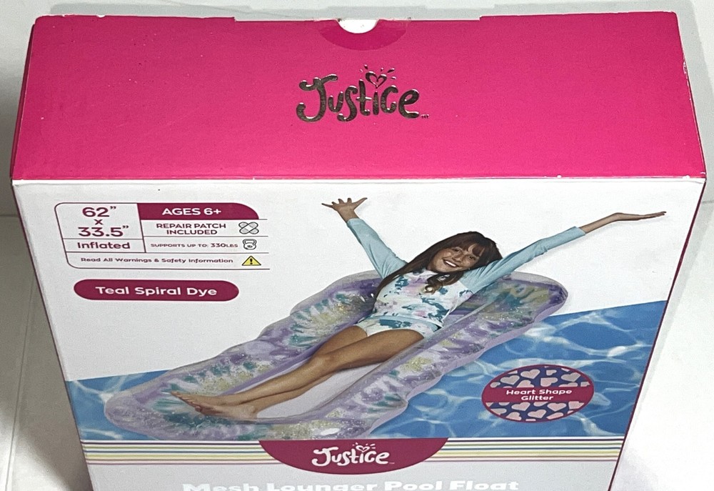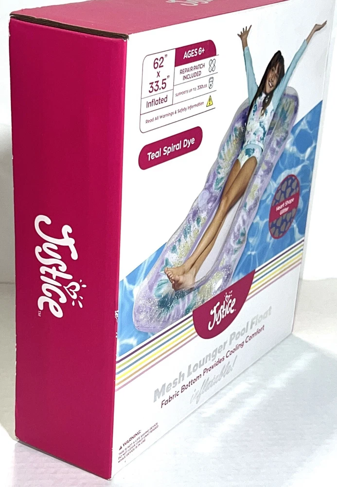 Brand NEW Sealed in Box Justice Mesh Lounger Inflatable Pool Float With Fabric Bottom That Provides Cooling Comfort. Teal Spiral Dye with Heart-Shaped Glitter. Built-in Drink Cup Holder. Repair patch included. Supports up to 330lbs. Measures: 62" x 33.5" inflated.