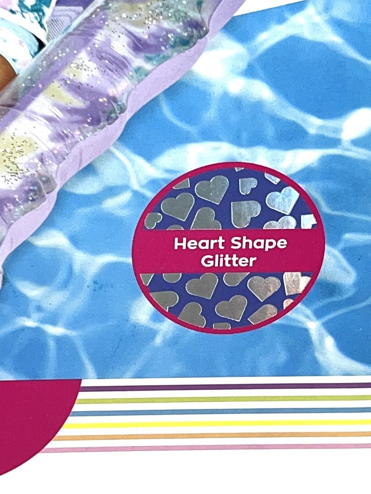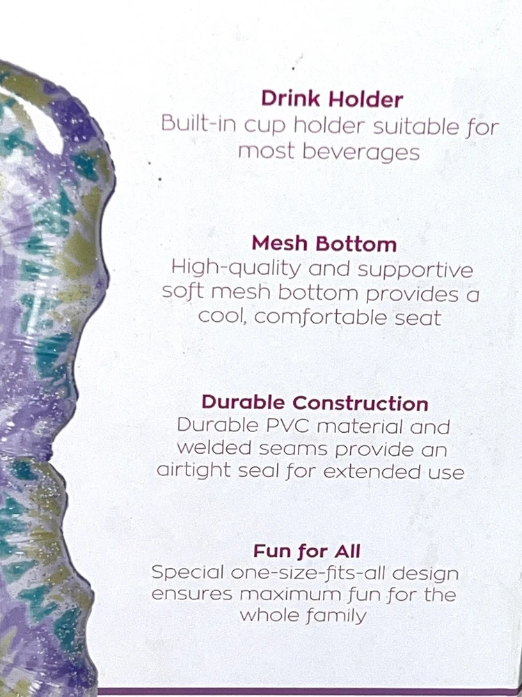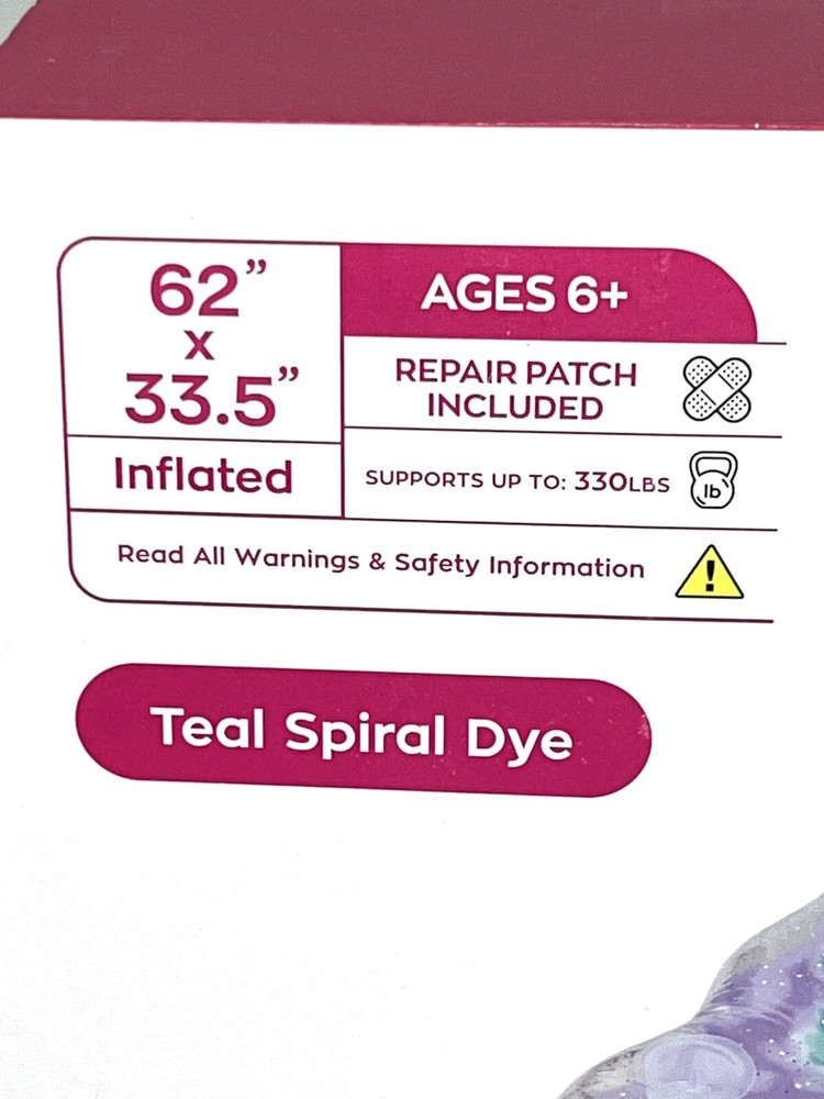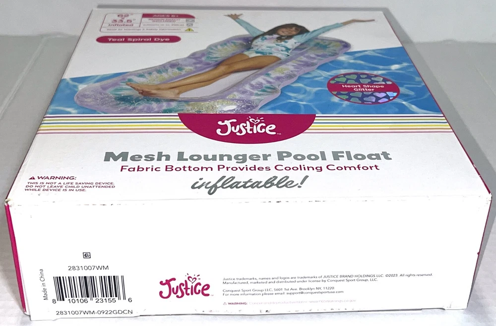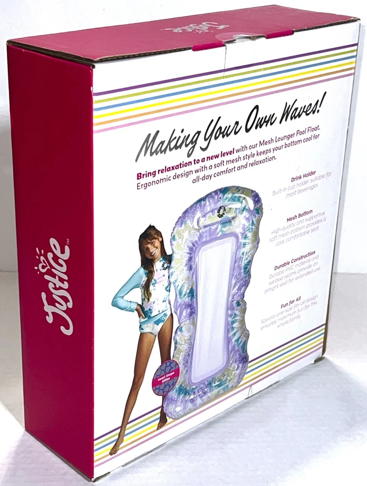 Brand NEW Sealed in Box Justice Mesh Lounger Inflatable Pool Float With Fabric Bottom That Provides Cooling Comfort. Teal Spiral Dye with Heart-Shaped Glitter. Built-in Drink Cup Holder. Repair patch included. Supports up to 330lbs. Measures: 62" x 33.5" inflated.