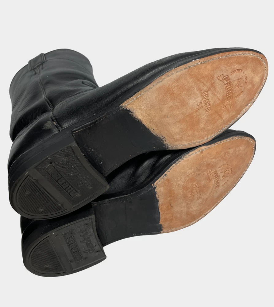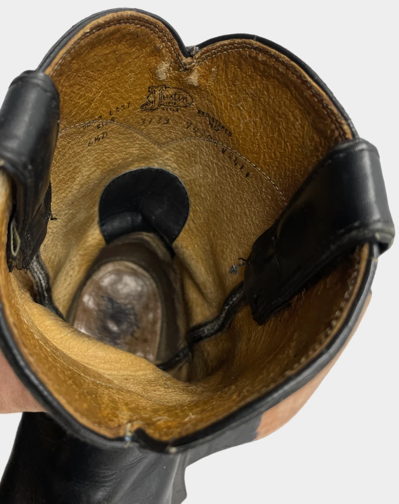 Product Line: Justin Boots Department: Men Theme: Biker, Cowboy, Motorcycle, Work Model: 3133 Shoe Width: D US Shoe Size: 6.5 Type: Boot Outsole Material: Leather Features: Comfort Upper Material: Leather Pattern: Solid Accents: Embroidered Brand: Justin Boots Color: Black Style: Western Closure: Pull On Toe Shape: Almond Toe