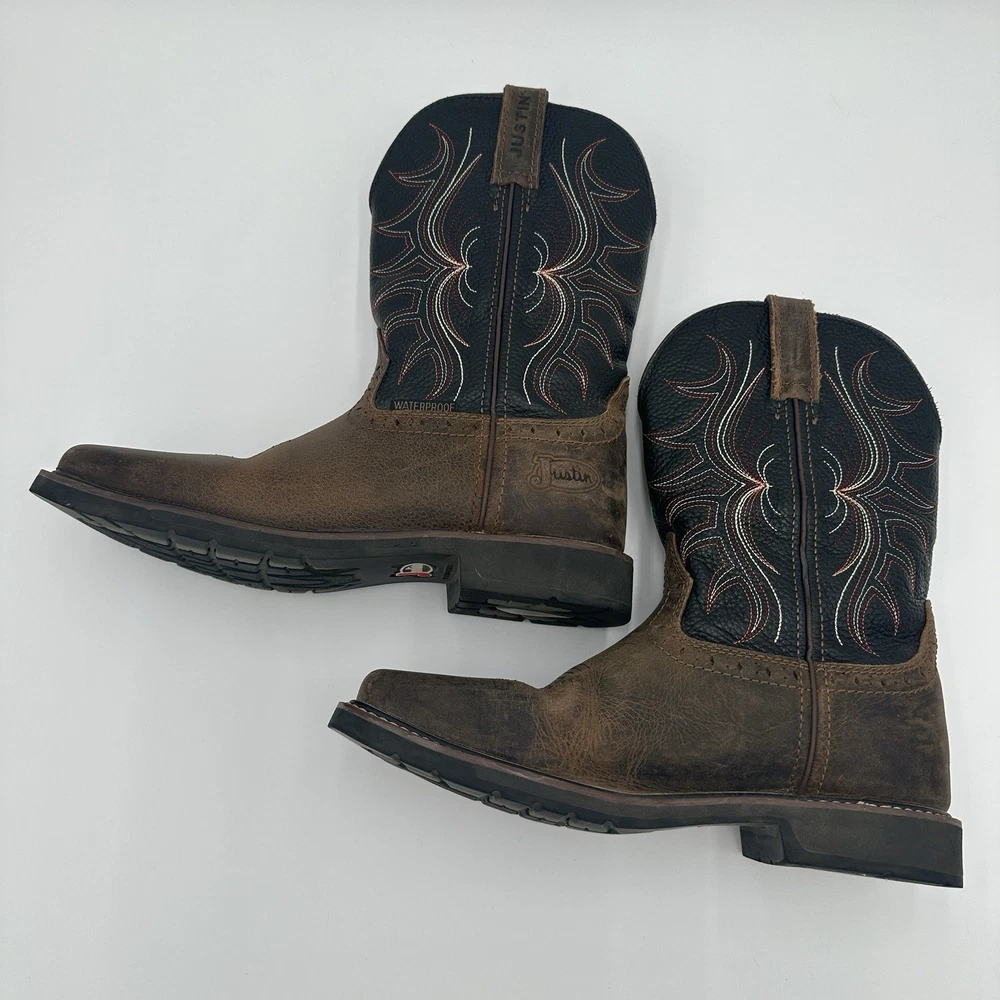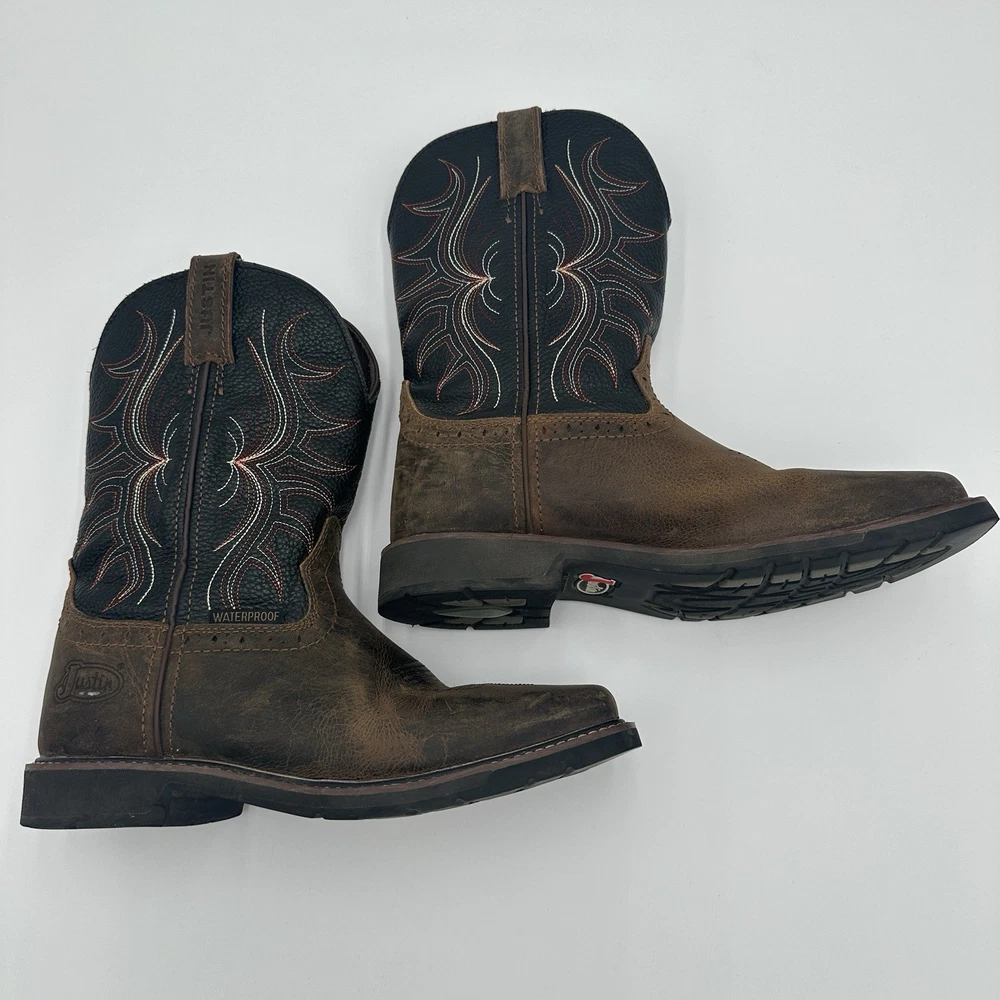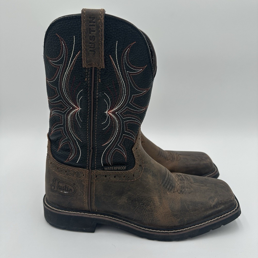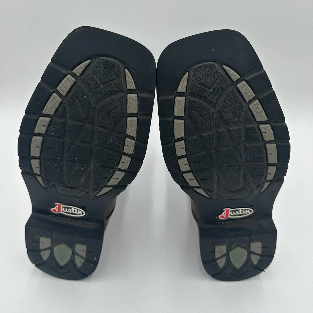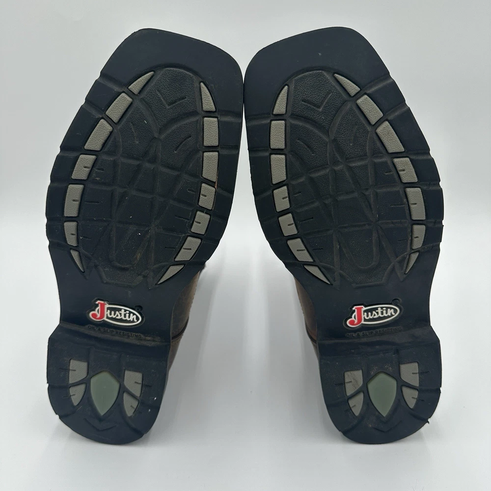 JUSTIN Boots Men’s Size 8.5 D Stampede Driller Dark Brown Square Toe Work #F2892 Pre-Owned Excellent Used Condition Leather upper Rubber sole Square toe Cowboy boots Oil and slip resistant Waterproof