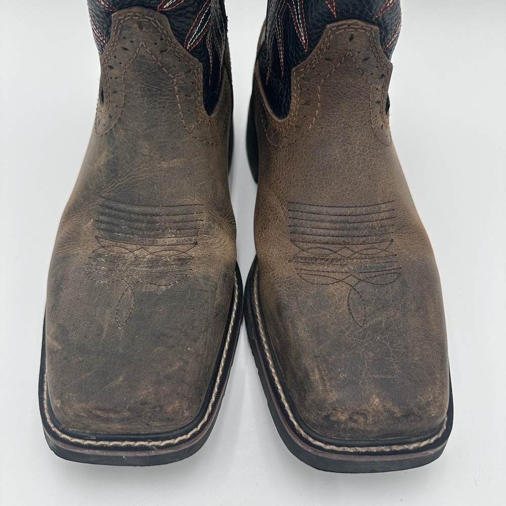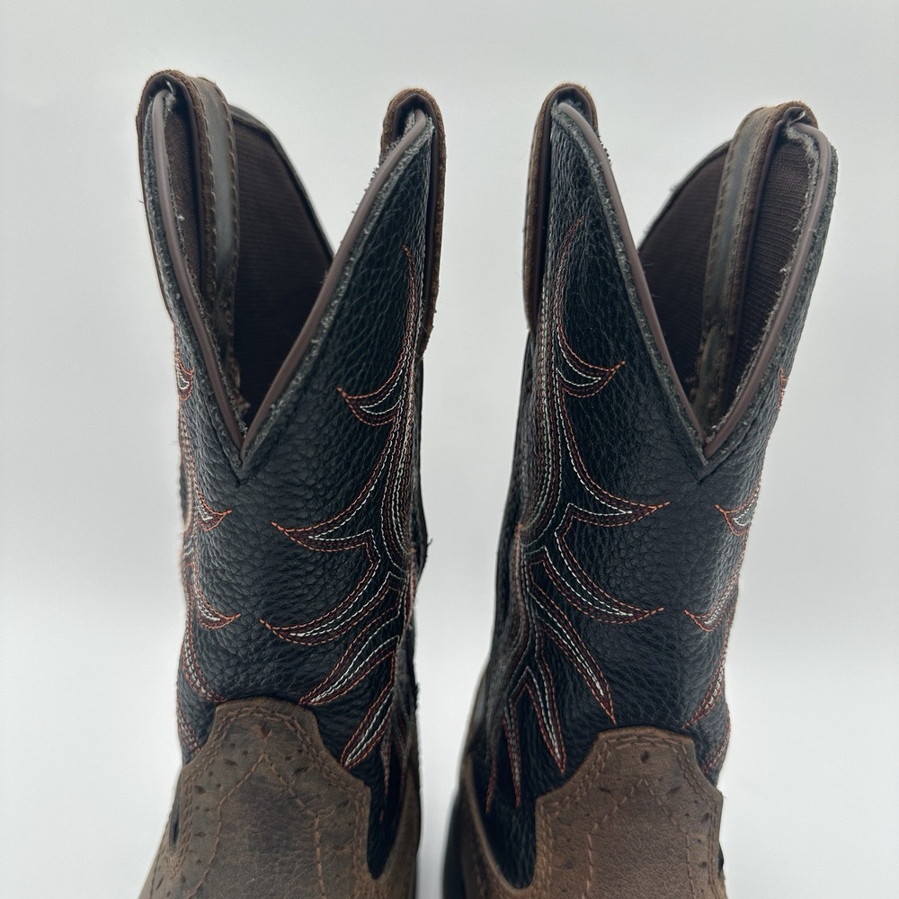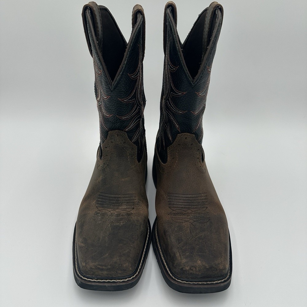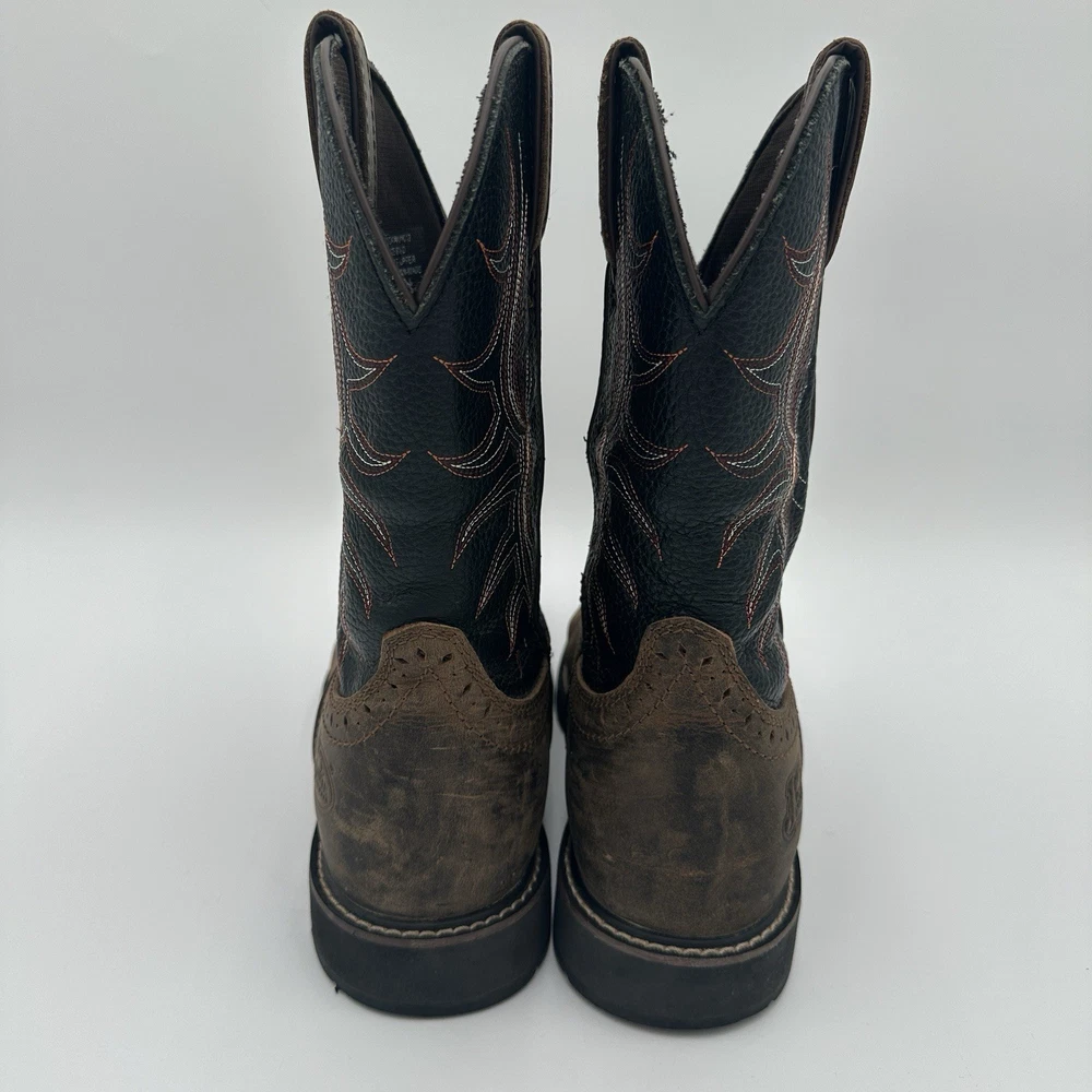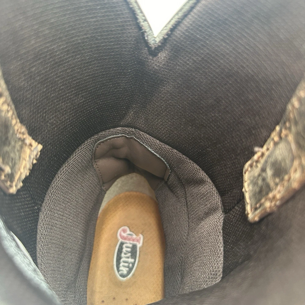 JUSTIN Boots Men’s Size 8.5 D Stampede Driller Dark Brown Square Toe Work #F2892 Pre-Owned Excellent Used Condition Leather upper Rubber sole Square toe Cowboy boots Oil and slip resistant Waterproof