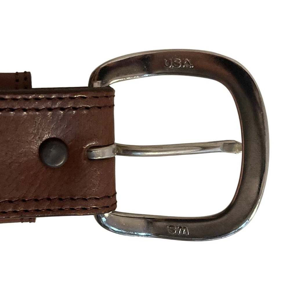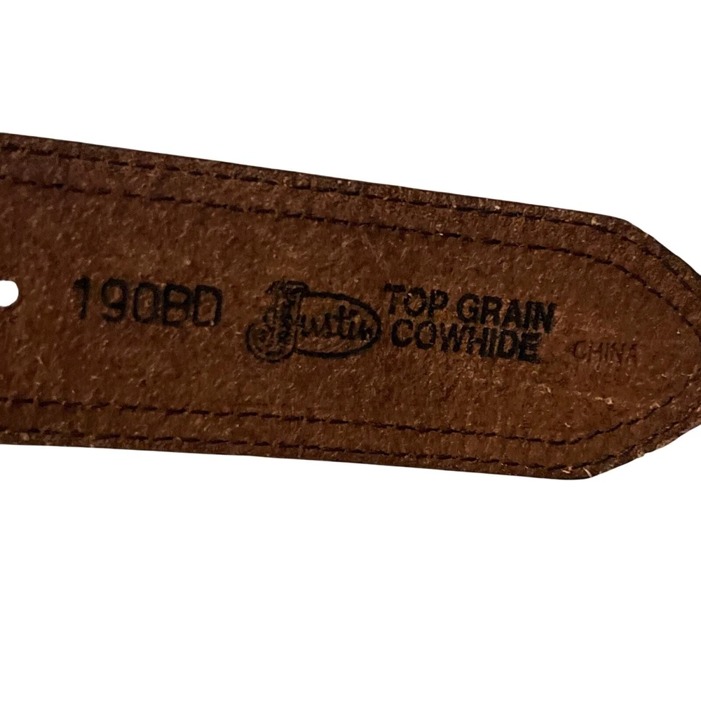Preowned Justin's Tan Tooled leather Belt with silver plated accents Size 36 Intricate designs carved into the leather. Conchos: Decorative metal studs. Silver-plated buckles: Classic Western buckles with the Justin logo. Rawhide accents: Braided rawhide details for a traditional touch. Please see photos for measurements and imperfections