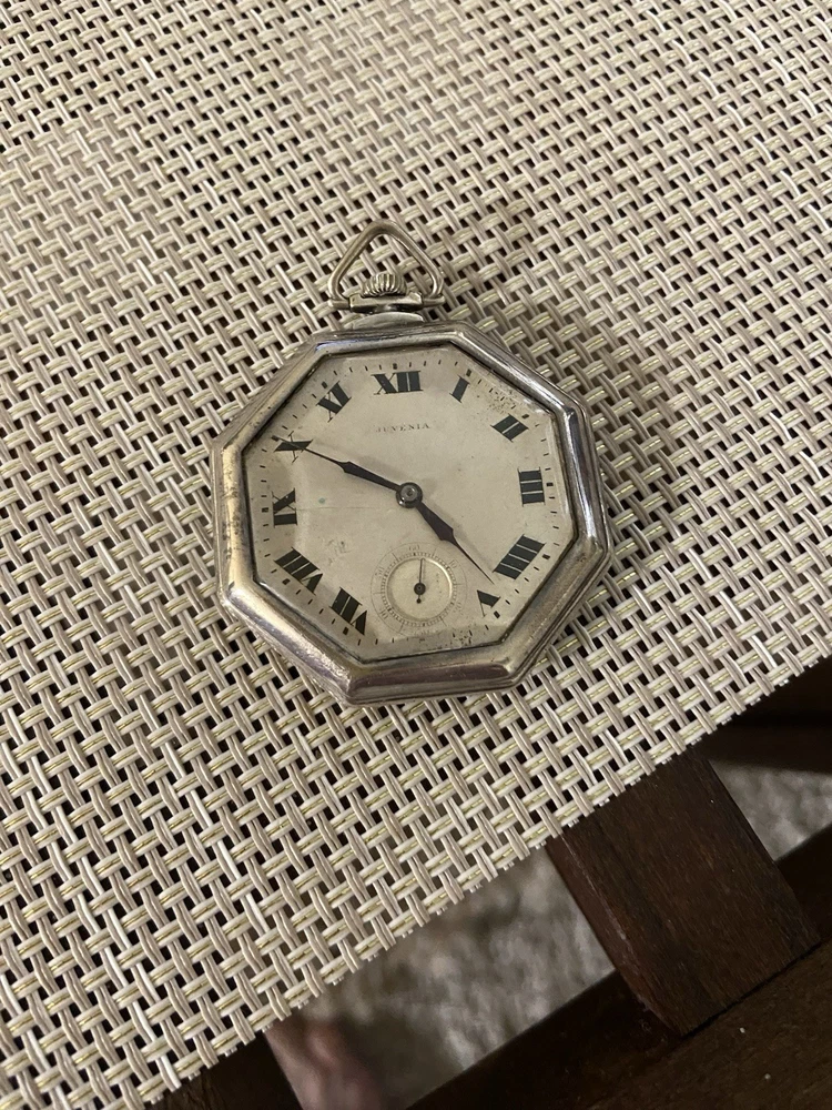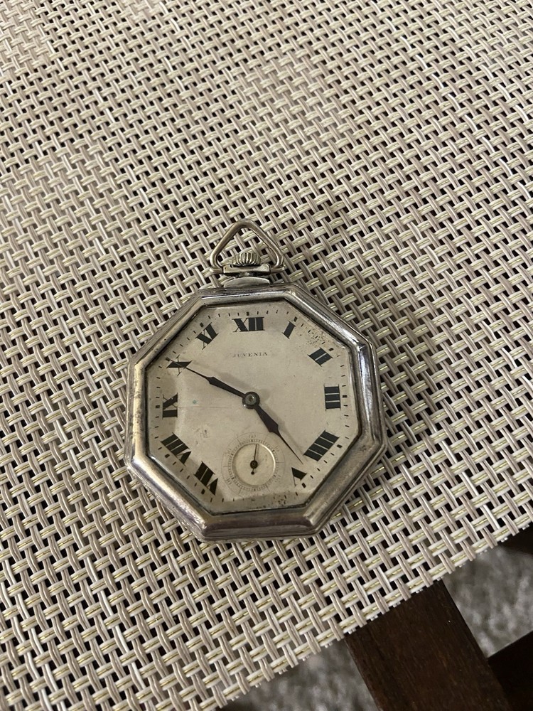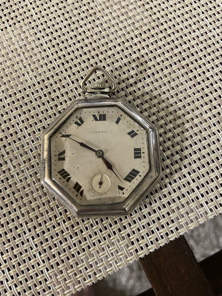With Manual/Booklet:NoWater Resistance:Not Water ResistantSeller Warranty:NoFeatures:12-Hour DialWith Original Box/Packaging:NoCustomized:NoType:Pocket WatchCase Color:SilverIndices:Roman NumeralsWith Papers:NoVintage:YesPersonalize:NoCase Material:Sterling SilverCountry/Region of Manufacture:SwitzerlandDepartment:Unisex AdultsBrand:JuveniaMovement:Mechanical (Manual)With Service Records:NoClosure:Open FaceDisplay:AnalogDial Color:Silver
