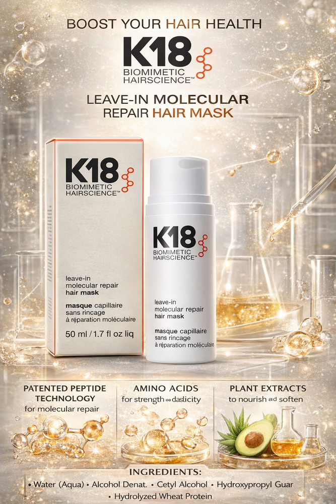 K18 Leave-In Molecular Repair Hair Mask 50ml / 1.7oz Professional Biomimetic Hairscience Treatment ✔ Brand New ✔ Authentic ✔ Salon-Grade Formula Revolutionary Molecular Hair Repair K18 Leave-In Molecular Repair Hair Mask is a breakthrough biotech treatment powered by patented K18Peptide™ technology. Designed to reverse damage from bleach, color, heat styling, and chemical services, this leave-in formula works at the molecular level to restore hair’s strength, softness, and elasticity. Unlike traditional conditioners that only coat the hair surface, K18 penetrates deep into the cortex to reconnect broken keratin chains. In just 4 minutes, hair feels smoother, stronger, and visibly healthier without weighing it down. Perfect for all hair types including straight, wavy, curly, coily, fine, thick, chemically treated, and color-damaged hair. Key Benefits Molecular Repair: Reconnects broken keratin chains Damage Reversal: Repairs bleach, color & heat damage Stronger Hair: Improves elasticity & resilience Frizz Control: Smooth, shiny, manageable finish Weightless Formula: No heavy residue Professional Results: Salon-quality performance How To Use Shampoo hair (do not condition). Towel dry thoroughly. Apply 1–3 pumps depending on hair length and thickness. Wait 4 minutes to activate. Do NOT rinse. Style as usual. Product Specifications ✔ Brand: K18 Hair ✔ Product: Leave-In Molecular Repair Hair Mask ✔ Size: 50ml / 1.7oz ✔ Type: Leave-In Treatment ✔ Suitable For: All Hair Types ✔ Condition: Brand New ✔ Authenticity: 100% Genuine Product K18 hair mask 50ml, K18 leave in repair treatment, molecular hair repair mask, K18 peptide hair treatment, salon professional damage repair, K18 biomimetic hairscience authentic.