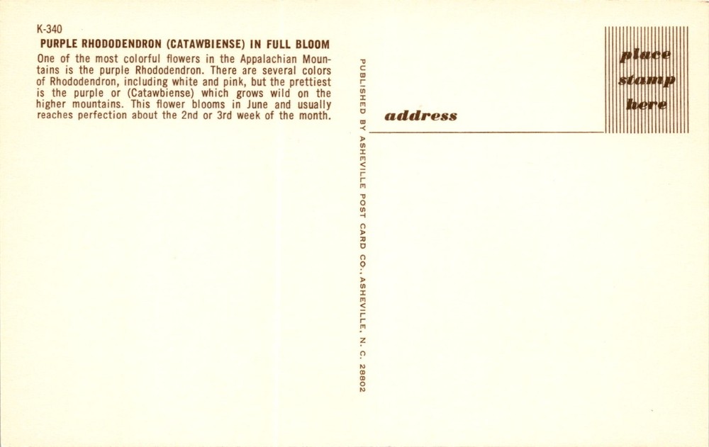 MAKE AN OFFER. THE MORE YOU BUY THE BETTER DEAL I WILL ACCEPT The postcard features a picture of a Purple Rhododendron (Catawbiense) in full bloom, highlighting one of the most colorful flowers in the Appalachian Mountains. Rhododendrons come in various colors, including white and pink, but the purple variety is considered the prettiest.
