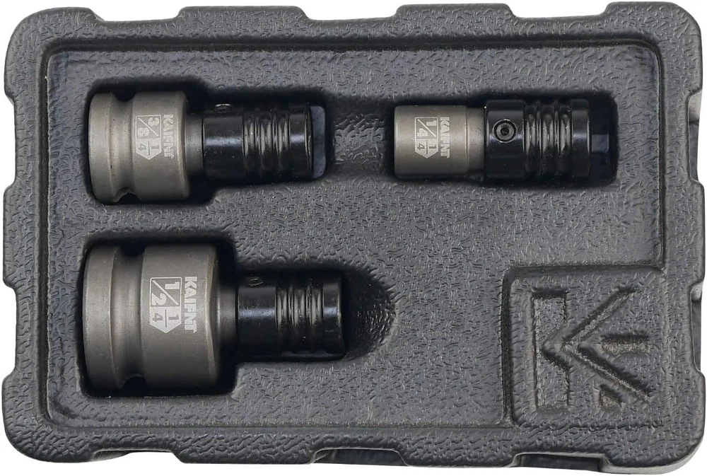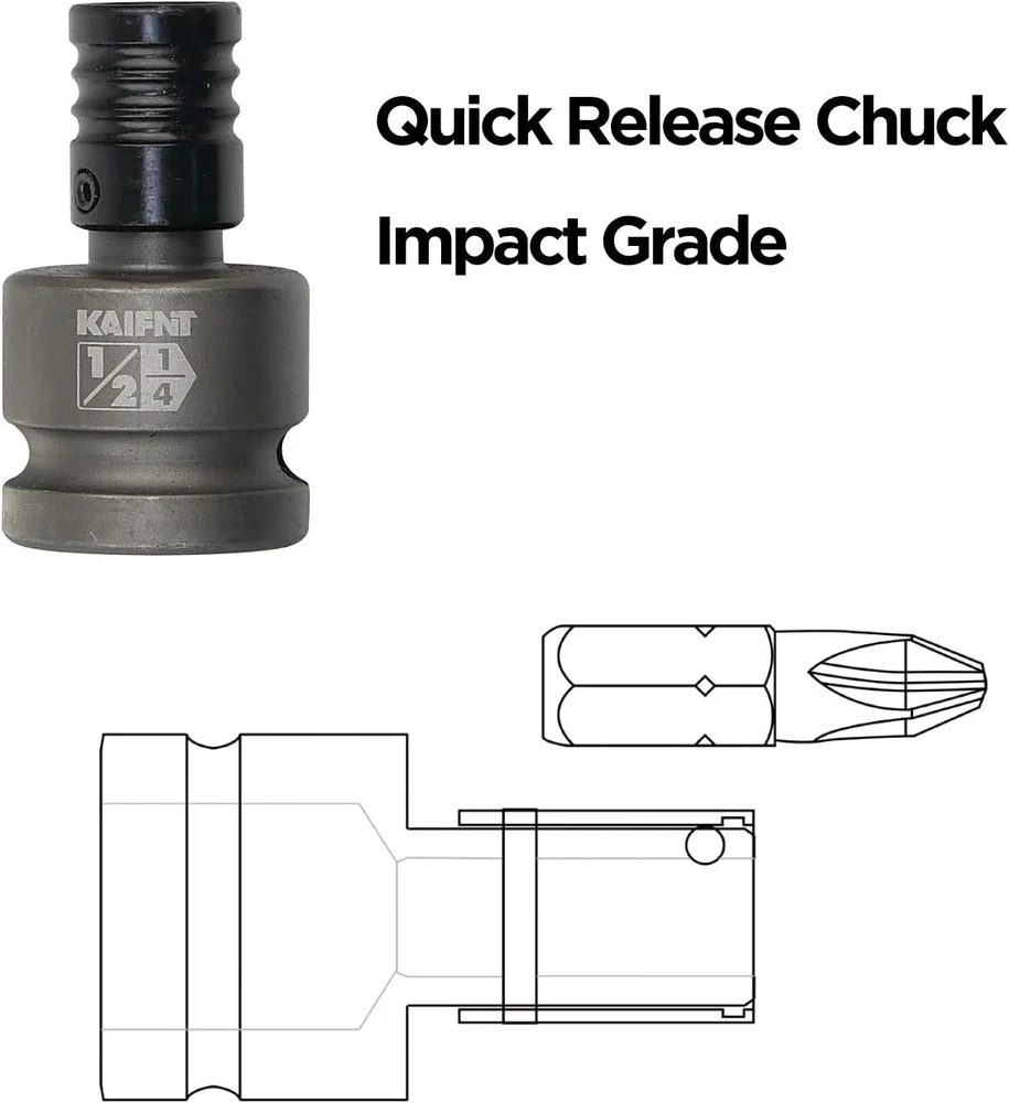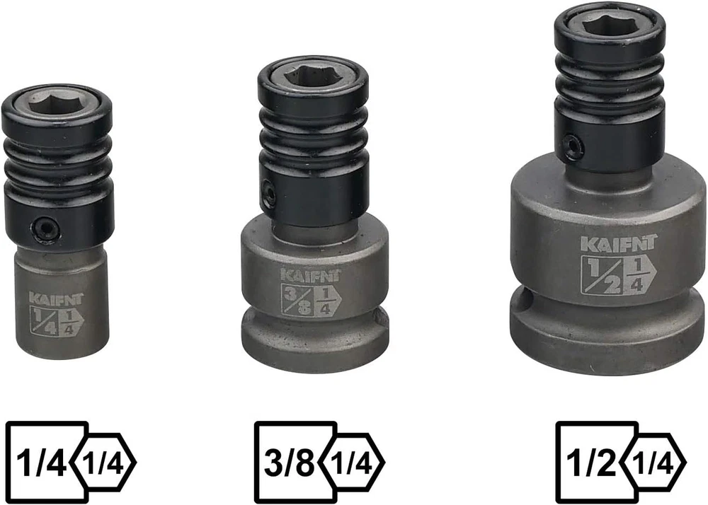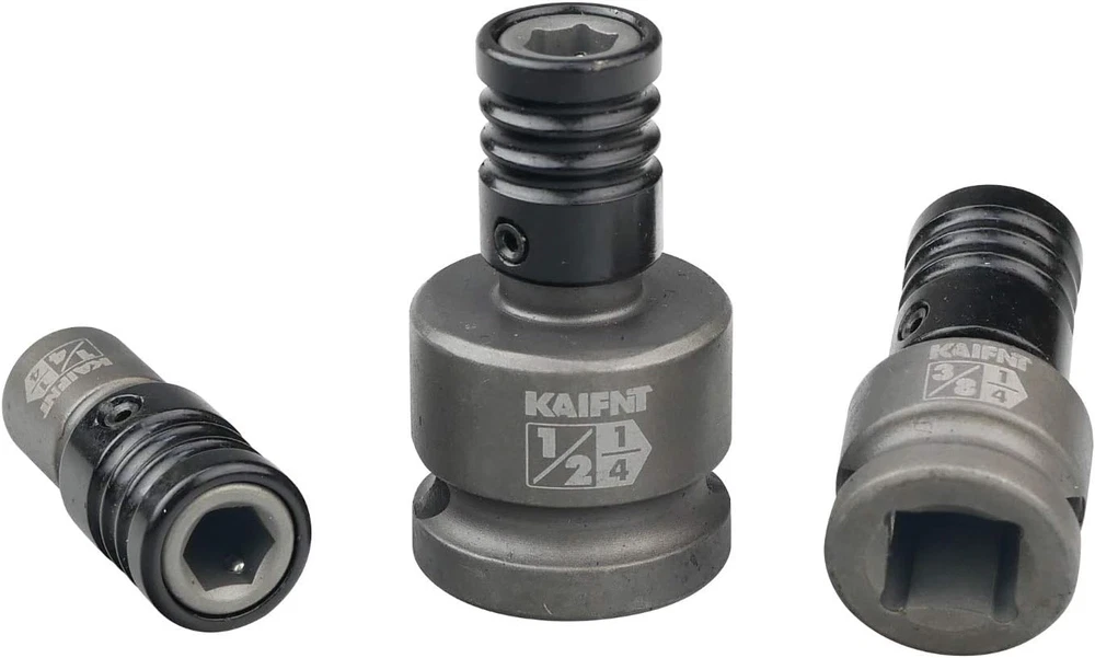 Engineered for use with impact wrenches Chrome molybdenum steel construction with protective gray phosphate finish Impact grade socket adapters are engineered for extreme durability and the ability to withstand the high shock Quick-release chuck allows for easy swapping between bits while working and rapid bit loading Includes 1/4, 3/8 and 1/2-inch square drive adapters for 1/4-inch hex shank bits Product Description KAIFNT K352 Square Drive Quick-Release Bit Holder Socket Adapters, Impact Grade, 3-Piece This tool has a hole on each end. One end which is a square drive hole designed to be snapped on to a impact socket wrench, the other end is bit holder with a quick-release chuck that designed to hold those little screwdriver type bits that you would typically use in an electric drill, or an electric screwdriver. Impact Grade Bit Holder, Square Drive Bit Adapter Quick change bit holder adapters adapt the impact wrench into a 1/4-inch hex shank driver. They are compatible with 1/4, 3/8 and 1/2-inch square drive ratchets, flex handles and extension bars. Comes with quick-release chuck for rapid bit change and constructed of durable chrome molybdenum steel alloy. Set Includes • 3-piece impact grade square drive to hex bit adapter • Storage Tray 1/4-inch square drive to 1/4-inch hex bit adapter, quick-release chuck 3/8-inch square drive to 1/4-inch hex bit adapter, quick-release chuck 1/2-inch square drive to 1/4-inch hex bit adapter, quick-release chuck A COMPANY OVERVIEW Our company is located in Taiwan and has been selling tools for more than 20 years. The factory has grown rapidly over the last several years, and employees have the experience, education and training. We value cooperation and quality management between factories. OUR PRODUCTS Kaifnt continually strives to bring fresh ideas and new products to its customers. Our products don’t have cheap goods from China and are dressed in frustration-free packaging. As such, customers and consumers don’t have to worry about the the quality and value in our products. Our mission is to offer our customers products that exceeds their expectations in cost and performance rather than being forced by cost-reduction.