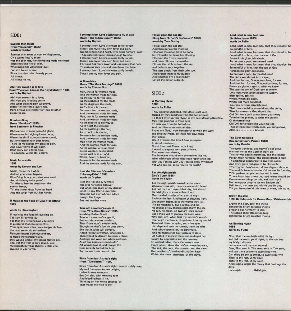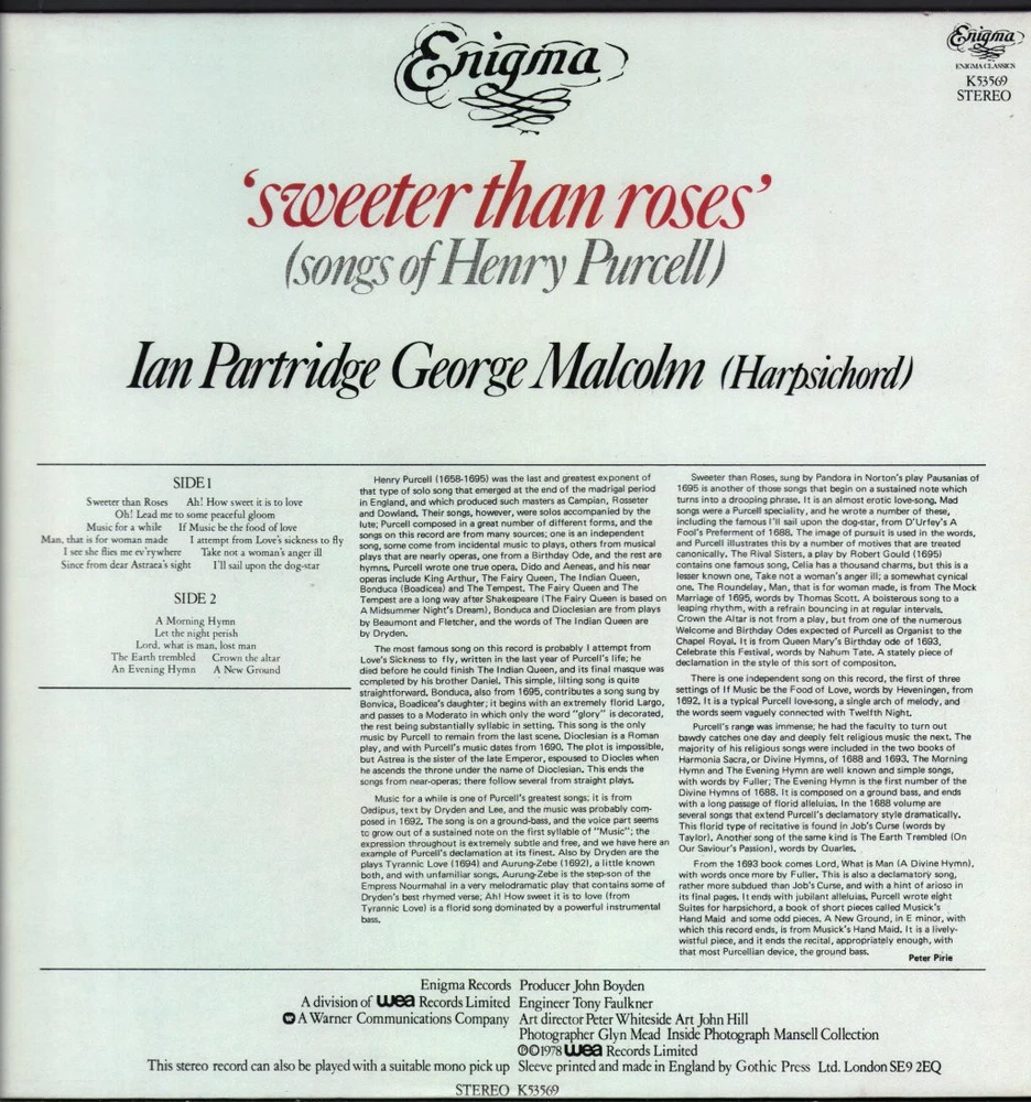 GRADING Our Grading System The table below is an overview of how our grading system works. The first grade is for the sleeve and second grade is for the media/disc, e.g. VG+/EX means that the item's sleeve is in Very Good Plus condition and the media/disc is in Excellent condition. If there is only one condition, e.g. /EX, it means that the item is not in a picture sleeve and that the media/disc is in excellent condition. Records that aren't in picture sleeves will either be in a company sleeve or a generic plain sleeve. If you have any questions, please get in touch. Condition Sleeve Media MINT (10/10) Mint, perfect Mint, perfect EX+ (9/10) Excellent plus, near mint Excellent plus, near perfect EX (8/10) Excellent, well looked after, clean, only slight signs of use Excellent, well looked after, clean, only slight signs of use EX- (7/10) Excellent minus, light wear and signs of use Excellent minus, light wear and signs of use VG+ (6/10) Very good plus, some moderate wear Very good plus, some scuffs, no deep marks VG (5/10) Very good, well used and worn Very good, well used and marked VG- (4/10) Very good minus, very worn Very good minus, very worn and marked GOOD (3/10) Good, some major wear Good, some major wear and scuffing FAIR (2/10) Fair, major wear Fair, major wear and scuffing POOR (1/10) Poor, severe wear Poor, severe wear and scuffing DELIVERY Combined Postage If you add all the items you wish to purchase from us to your shopping basket/cart, and then go to the checkout page from the shopping basket page, the shipping cost will be automatically combined. Packaging All of our items are parcelled using strong specially designed packaging, each vinyl in an order is placed in a clear plastic sleeve and plain paper white sleeve, and is separated from its cover (unless it is advertised as sealed), to prevent any damage during transit. If an item is sealed, and you would prefer the vinyl to be placed outside of its sleeve before dispatch, please let us know. Prices You can see all delivery options and prices for an item on the "Postage and payments" tab. Tracked delivery If you wish to have a tracking number with your order, please select the "Signed" or "Express" delivery option, "Standard" delivery does not include a tracking number. SHOP Click here to view our Ebay shop, with over 200,000 items in stock FAQ What is a "gatefold" sleeve? A cover that opens like a book, the additional space compared to a regular sleeve means there is usually more artwork and/or liner notes. These are often used for double albums, with one record kept in each half of the cover. Does a used item include the original inner sleeve/insert/poster etc.? We will always include in the description if a used item includes any additional parts, e.g. "with inner" or "includes poster", if you know an item originally came with any additional parts, such as a printed inner sleeve, and it isn't mentioned in the description, then generally the used item won't include it, but please feel free to ask. New items will always be complete, unless otherwise specified. CATEGORIES Shop Home 10" Vinyl Records 12" Vinyl Records 7" Vinyl Records Cassettes (Tape) CDs (Compact Discs) LP Vinyl Records Music Memorabilia Other Artist Ian Partridge / George Malcolm Title Henry Purcell - Sweeter Than Roses (Songs of Henry Purcell) Format LP Vinyl Country UK Label Enigma Catalogue Number K53569 Year 1978 Description 18 track stereo in gatefold sleeve Condition (Sleeve/Disc) EX/EX Track List A1. Sweeter Than Roses A2. Ah! How Sweet It Is To Love A3. Oh! Lead Me To Some Peaceful Gloom A4. Music For A While A5. If Music Be The Food Of Love A6. Man, That Is For Woman Made A7. I Attempt From Love's Sickness To Fly A8. I See She Flies Me Ev'rywhere A9. Take Not A Woman's Anger Ill A10. Since From Dear Astraca's Sight A11. I'll Sail Upon The Dog-Star B1. A Morning Hymn B2. Let The Night Perish B3. Lord, What Is Man, Lost Man B4. The Earth Trembled B5. Crown The Altar B6. An Evening Hymn B7. A New Ground DELIVERY INFORMATION If you wish to have a tracking number with your order, please choose the Signed or Express delivery option, the Standard delivery option does not include a tracking number. Please note, the Express option for delivery outside of the UK includes a tracking number, but has the same delivery time as the Standard option. ABOUT US Vinyl Tap has been in the business of selling music for over 30 years, and in that period we have supplied many thousands of collectors and music fans around the globe with vinyl, CDs and music memorabilia. You can check out the over 200,000 items that we have in stock on our Ebay shop, here . Artist: Ian Partridge / George Malcolm - Title: Henry Purcell - Sweeter Than Roses (Songs of Henry Purcell) - Format: LP Vinyl - Country: UK - Label: Enigma - Catalogue Number: K53569 - Year: 1978 - Description: 18 track stereo in gatefold sleeve