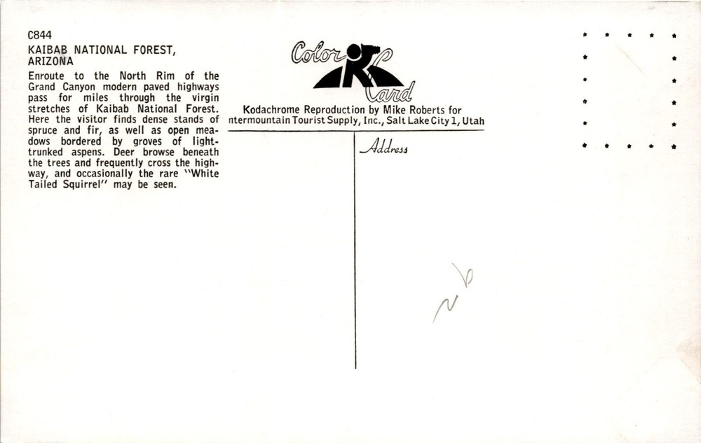 The postcard depicts the Kaibab National Forest in Arizona, which is located on the way to the North Rim of the Grand Canyon. The forest features modern paved highways that traverse through its pristine landscapes. Within the forest, visitors can explore dense stands of spruce and fir trees, as well as open meadows with groves of light-trunked aspens.