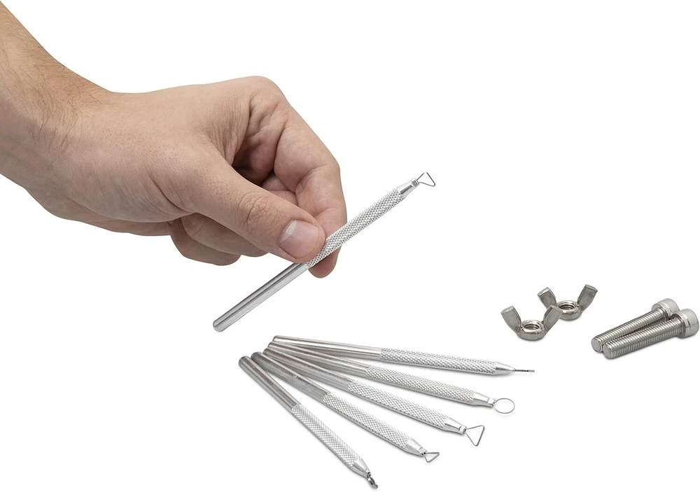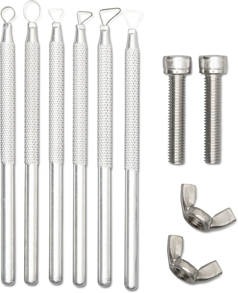 Product Description: KATAI Pottery Bat Set with Sculpting Tool Kit and Bat Pins Pottery Wheel Bats Pottery wheel bats are extremely convenient tools to have in a ceramics studio. They are flat discs that attach to a pottery wheel head and are available in a variety of sizes and shapes. They are made from a variety of different materials such as; plastic, wood and plaster. Typically pottery heads have two holes that fit snugly onto a pair of bat pins that are inserted into your wheel head. Once it is attached to the wheel head, then you can work directly on the bat. You can then lift it off your wheel head, with the thrown pot, without disrupting your work. Easy to Use By drying your pots on your square inserts you are saving precious space in your studio. To use your bat system simply lift the inner bats from the insert tab in the outer bat by using your fingers or a flat potter's tool. Heavy Duty Materials Your pottery wheel bats help protect your work and your valuable equipment. The bat and the pot can be easily removed from the potter's wheel head so there is no need to directly handle your creations. Your inserts are made out of durable masonite and the outer bat is made from a very strong and water/warp-resistant exterior grade wood material. Do not leave your outer bat or inserts sitting in water. Just gently clean and dry. Sculpting Tool Kit and Bat Pins Included in this deal is a durable and easy-to-clean 6 piece aluminium sculpting tool kit. This lightweight kit works well on various modelling materials including clay and wax. Also included is a pair of bat pins that work on most brand wheels. What is Included? 1 x Round Outer Bat 6 x Square Inner Bats 6 x Sculpting Tool Kit 2 x Bat Pins Your space saving bat system for a potter's wheel has a bat adapter with removable inserts. This bat set fits standard wheel heads. The pin holes are spaced 10" apart on center. Your pottery bat insert system is made from premium moisture-resistant wood. Included in this offer is a 6-piece aluminium sculpting tool kit 9 (12 cm - 13 cm) and a set of bat pins (1 1/4" long). Your KATAI pottery bat set comes with a 12 inch round outer bat and a set of six 7 inch square inner bats.