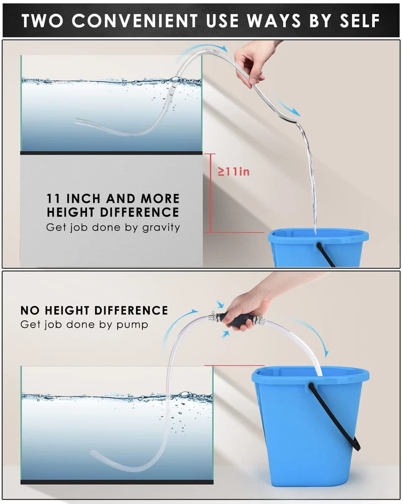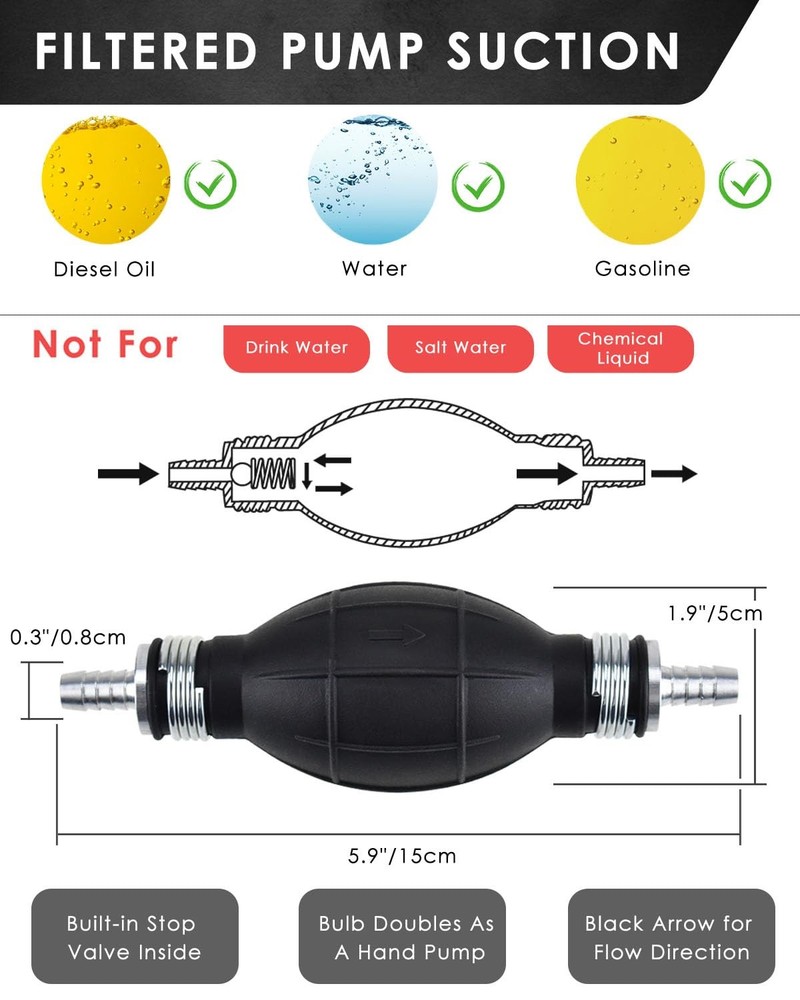 KATUMO Gasoline Siphon Hose, Gas Oil Water Fuel Transfer Pump, 1 pack Product Details Efficient Manual Siphon Pump: Hand siphon hose pump for gasoline, oil, water, diesel and other common liquids, ideal for emergency transfer. Also suits for fish tank, aquarium tank, small fountain and small air cushion swim pool water transfer. NOT for edible oil, drink water, salt water and any chemical liquids. Easy and Safe Siphon Pump: This gas siphon hand pump weights 171g only, Say Good-bye to the dangerous and inefficient mouth suction way. Just connect the hoses to the pumb bulb, the black arrow towards the fluid following direction, put the upper hose into the source tank, a few squeezes of the bulb will get the fluid started following, then put the lower hose into the receiver tank, the fluid will flow automatically (The source fluid must be higher 11 inch or more than the receiver). Premium Quality Rubber: The pump bulb is made of high quality rubber, thick and sturdy, build-in stop valve prevent backflow of the fluid for siphoning liquid flow quicker and faster. With 2 flexible PVC transparent hoses for visual liquid flow progress, high temperature and corrosion resistant, can be used for a long time. (The two hoses are in diferent size. The longer hose or the shorter hose can be placed at the source container or the target container based on your use condition) Clip and Retainer Use: The two metal clips are for fixing the hoses in place with the pump bulb, prevent slippage or leakage. And an adjustable hose retainer is for keeping the hose standing into the container or receiver, avoid slipping out and permit one hand-free operation. Multi-Use Manual Transfer Pump: Lightweight hand siphon fuel pump is enough for simple daily use, suits for medium and small type equipments without anti-theft filter net, such as brush cutter, lawn mover, hedge trimmer, snow blower, motorcycle, scooter, ATV, lawn tractor etc, NOT for big truck types.
