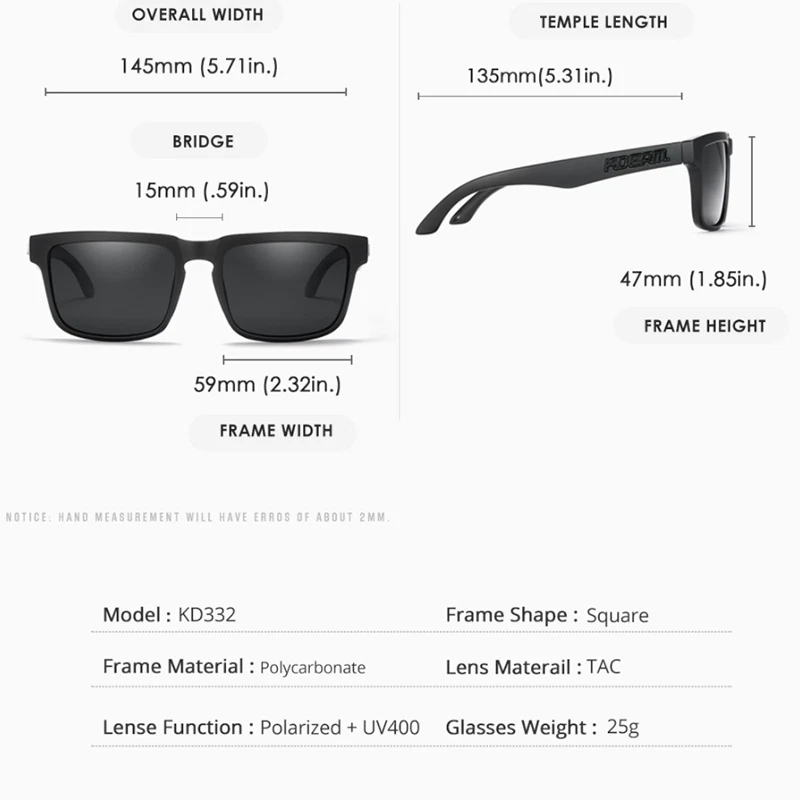 KDEAM Square Classic Polarized Sport Sunglasses Men Women Driving Shade Glasses Description Brand:KDEAM Condition: New without Tags Frame Material : Plastic Lens Material:TAC Visible Perspective Rate: 99% Anti-UV rating: UV400 Whether Polarized : Yes. Gender :Men/Women Lens width: about 59 mm Lens height: about 47 mm Bridge : 15 mm Frame Width : about 145 mm Temple Length : about 135 mm Package included: 1*Sunglasses(Not include boxes and other accessories) Note: 1. Due to the different monitor and light effect, the actual color of the item might be slightly different from the color showed on the pictures. Thank you! 2. Please allow 1-3mm measuring deviation due to manual measurement. Features Reflective UV Protection UV400 MPN Does Not Apply Department Unisex Adults Frame Material Plastic Country/Region of Manufacture China Brand KDEAM Lens Material Mirror, TAC Style Square Personalized No Lens Technology Polarized Theme Classic, Designer, Outdoor, Sports Type Sunglasses Temple Length 135 mm Frame Color Multicolor Model KD332