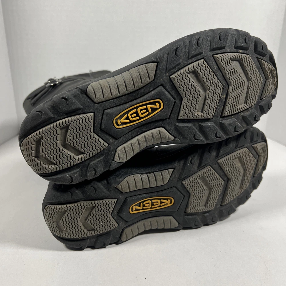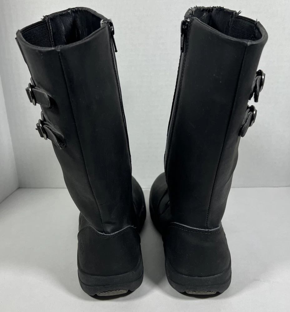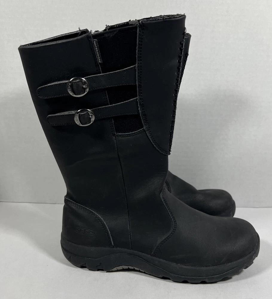 *Please review all photos closely before purchasing due to boots having signs of use and wear with some faint scuffs and marks to rubber sidewalls and leather exterior and right boot having some material loss on inner upper portion of front boot leather edge from being preowned to prevent return.* Elevate your winter style with these KEEN Bern Baby Bern boots. Made of black leather, these knee-high riding boots feature a buckle accent and logo detail. The boot has a side zip closure and standard shoe width, making it easy to put on and take off. Perfect for the colder months, these boots have a solid pattern and are suitable for women's US shoe size 5 and UK shoe size 4. The calf width is regular, ensuring a comfortable fit. These boots are a great addition to your winter wardrobe, providing both style and practicality. Zip Up Boots Keen Durable Original Classic Iconic Winter Wear Waterproof Leather Boots Travel Business Work Snow Dry Warm