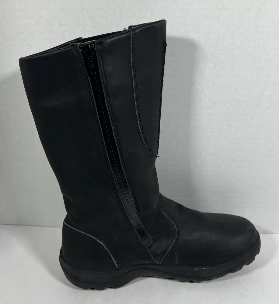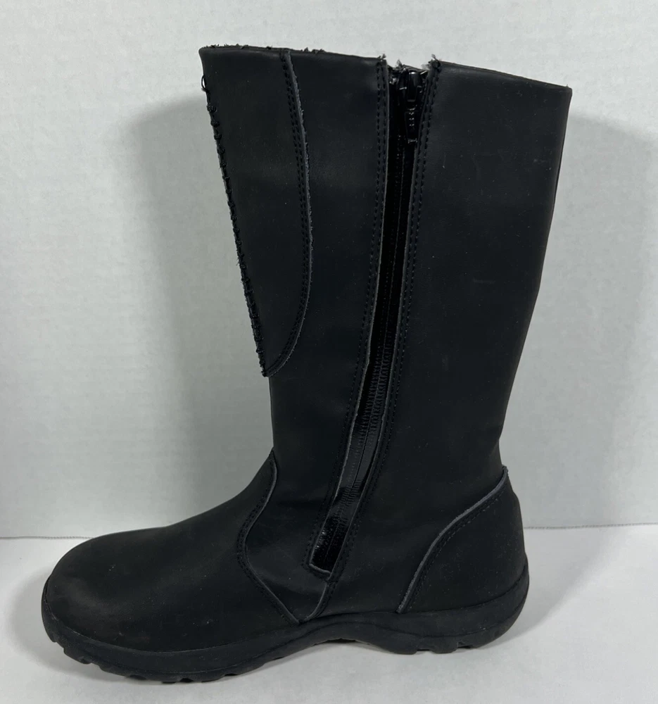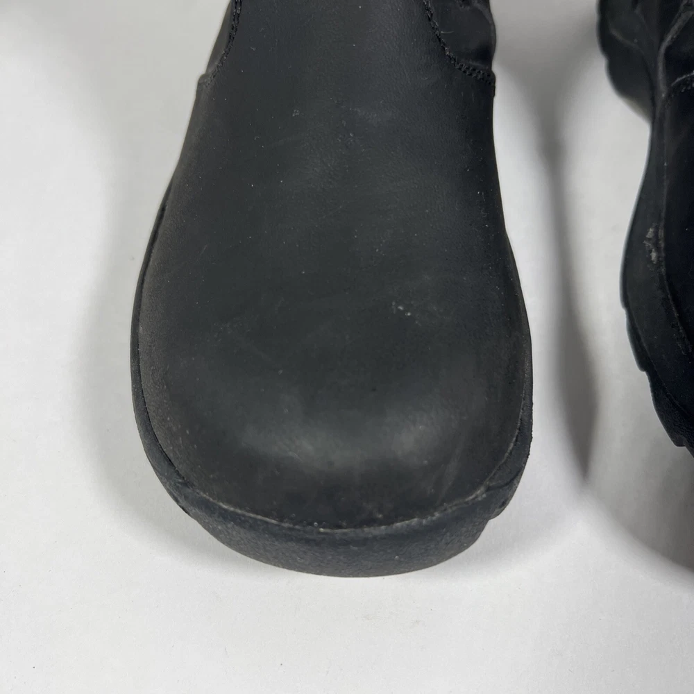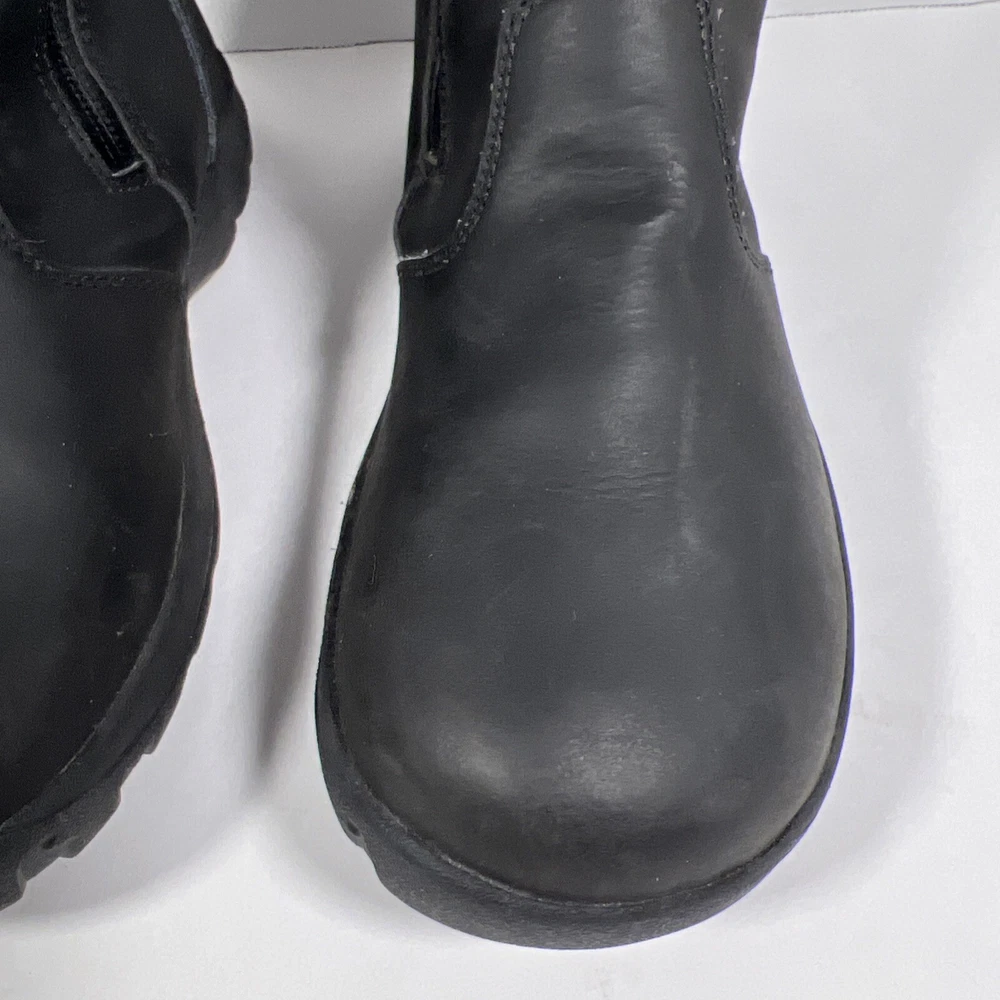 *Please review all photos closely before purchasing due to boots having signs of use and wear with some faint scuffs and marks to rubber sidewalls and leather exterior and right boot having some material loss on inner upper portion of front boot leather edge from being preowned to prevent return.* Elevate your winter style with these KEEN Bern Baby Bern boots. Made of black leather, these knee-high riding boots feature a buckle accent and logo detail. The boot has a side zip closure and standard shoe width, making it easy to put on and take off. Perfect for the colder months, these boots have a solid pattern and are suitable for women's US shoe size 5 and UK shoe size 4. The calf width is regular, ensuring a comfortable fit. These boots are a great addition to your winter wardrobe, providing both style and practicality. Zip Up Boots Keen Durable Original Classic Iconic Winter Wear Waterproof Leather Boots Travel Business Work Snow Dry Warm