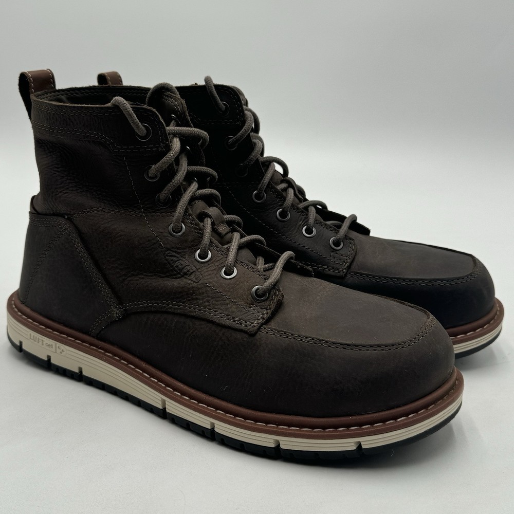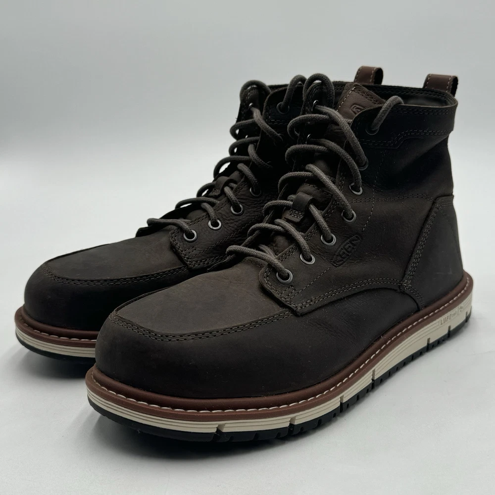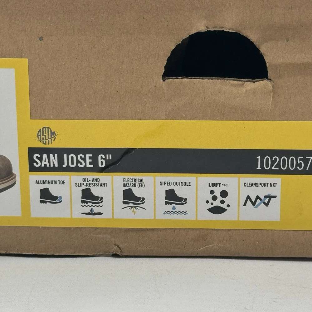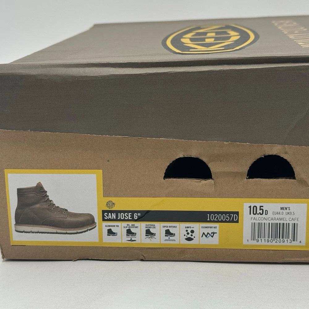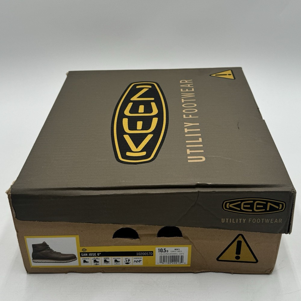 Keen San Jose 6” Work Boots Falcon/Caramel Cafe Crafted for durability and comfort, these KEEN Men's San Jose 6'' Waterproof Aluminum Toe Work Boots are a reliable choice for those in need of sturdy footwear. The brown boots come in size 10.5 with a medium width, ensuring a snug yet comfortable fit for the majority of men's foot sizes. Designed to meet the demands of rigorous work environments, these boots feature a waterproof membrane that keeps your feet dry in wet conditions, and an aluminum toe cap that offers superior protection. Ideal for various industries, these boots are a practical addition to any professional's safety gear.