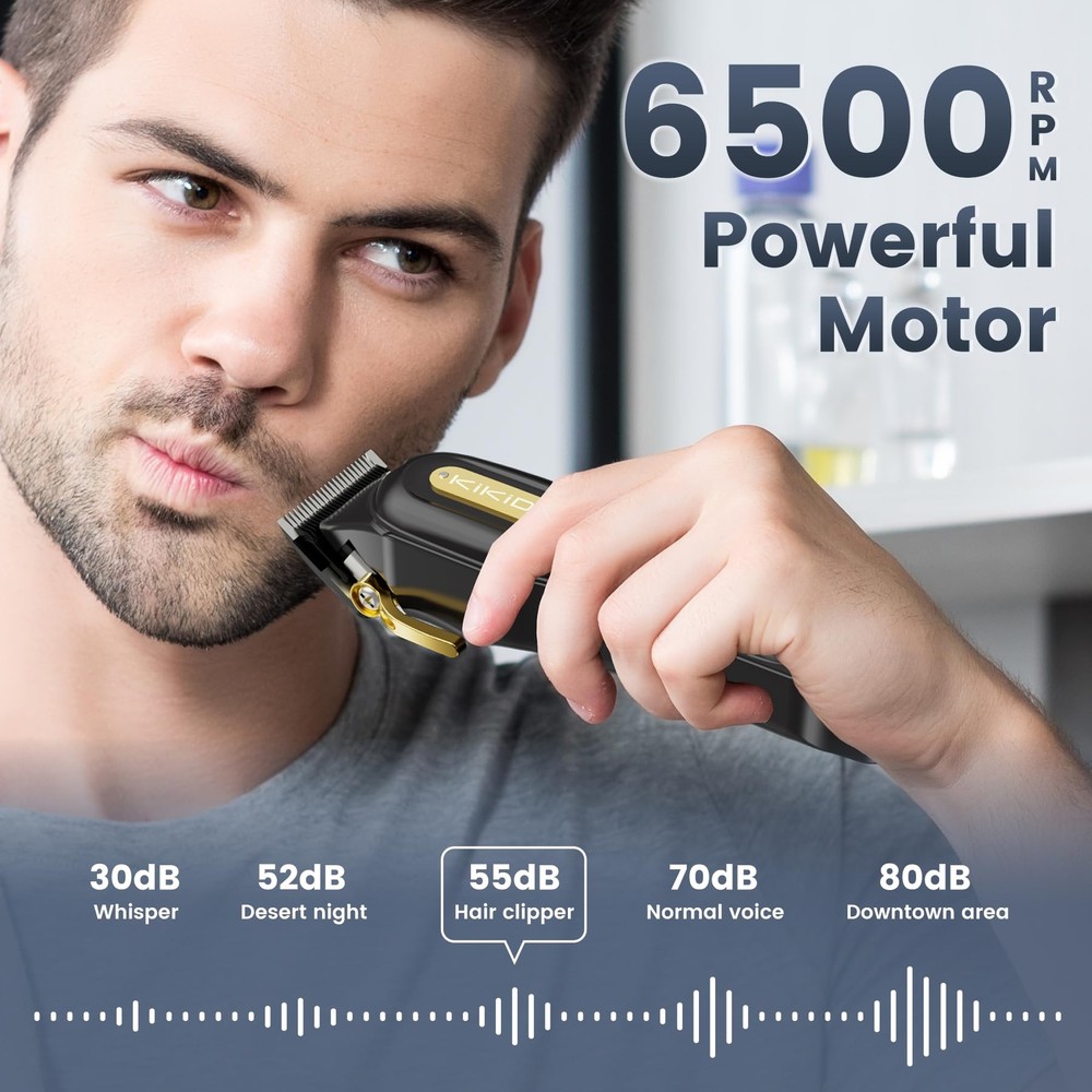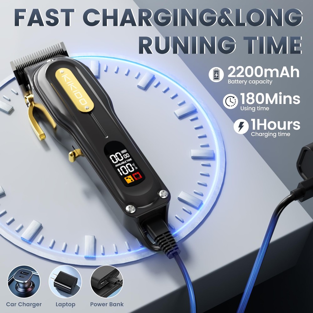 【Professional Hair Clipper Set】 -- Elevate your grooming routine with our hair cutting kit, a perfect gift for stylish men who value performance, mobility, and convenience. The hair clipper comes with 6 guide combs (1.5, 3, 4.5, 6, 9, 12 mm), USB charging cables. Upgrade your style confidently every day with our premium hair clippers 【Extended Battery Life and Adjustable Length】 -- Our cordless design boasts a high-capacity battery, providing up to 5 hours of usage with a mere 3 hours of charging time. The USB cable's compatibility with various chargers ensures maximum mobility and convenience. Additionally, the adjustable cutting length, ranging from 0.5 mm to 2 mm, guarantees a consistently fresh and stylish cut 【Quiet & Robust Rotary Motor】 -- Experience the strength of our electric clipper's motor, designed to effortlessly cut through even the thickest hair, catering to both professional barbers and at-home users. Electric hair clippers can provide a more peaceful and comfortable haircutting experience by reducing noise levels 【Smart Digital LCD Display】 -- Effortlessly monitor your clipper's performance with the built-in digital display, offering real-time information on remaining charge, charging status, and lubrication levels. The ultra-high-definition LED display equips you with all the details you need for optimal performance and achieving the perfect cut 【Warm tips】 -- If you find a new product with grease stains and a little hair, please do not worry, this is the factory quality inspection done by our factory, you then clean up can be, we guarantee the quality and premium quality of all products