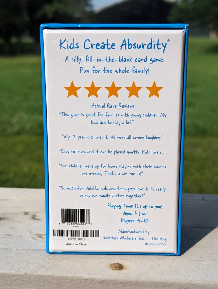 The Kids Create Absurdity card game is a must-have for families who love to laugh together. With a 2020 release, this game promises to offer hours of fun and entertainment for all ages. Featuring cards with funny themes and prompts, players are encouraged to let their imaginations run wild and create hilarious and absurd scenarios. The game is perfect for those who enjoy family game nights and want to add a new and exciting twist to their routine. Whether you're a seasoned gaming enthusiast or a casual player, Kids Create Absurdity is easy to learn and play. So, get ready to have a blast with your loved ones and let your creativity shine with this hilarious card game.