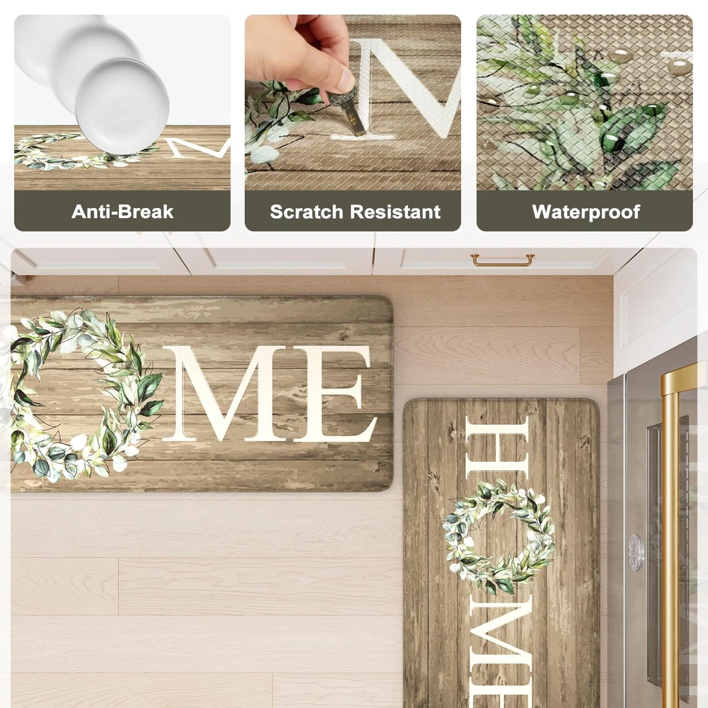 Anti-fatigue Kitchen Mats:Cushioned kitchen mats for floor are constructed with 0.47 inch (12 mm) thick, and long-lasting memory foam center provides the comfort for your feet, back and legs,which can support you while cooking 2PC Kitchen Rugs:The kitchen mats contain 2 rectangular rugs (17 x 47 inches and 17 x 29 inches), 2 Pcs kitchen mats may be used separately or in combination to meet different needs.The mats are made of premium materials, which are friendly to your kids and pets Anti-Slip Standing Mats:Equipped with a non slip rubber bottom so that the mats stay in place both on hard or carpet floors.The beveled edges of the kitchen mats help prevent tripping,fully protect you and your family's safety.Tip:Should be placed on dry surface during use Waterproof & Easy to Clean:The anti-fatigue mats are constructed with heavy-duty PVC outer lining, which is waterproof, oilproof, and stain-resistant. Just wipe the mats down with a damp cloth or use a hand-held vacuum to clean them,saving your time and energy Versatile:KIMODE provide Home Letter Design kitchen rug sets to match your home decor.Soft thick foam provides ample support for standing in kitchen sink,laundry room, office,bathroom,dinning room,or any other high-traffic area