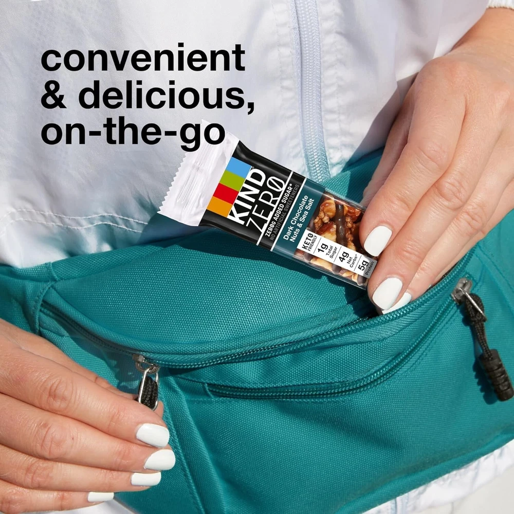 Contains five (5) KIND ZERO Added Sugar Bars; 1 ingredient almonds Keto friendly bars have4g net carbs, 5g protein and 1g total sugar per serving; 0g added sugar (Not a low-calorie food. See nutrition information for calorie and fat Made with nutrient-dense almonds and peanuts, plus chocolatey top drizzle and bottom coating Enjoy as a nutritious on-the-go snack any time of day No artificial sweeteners or sugar alcohols; Non-GMO Project Verified; low sodium; Kosher