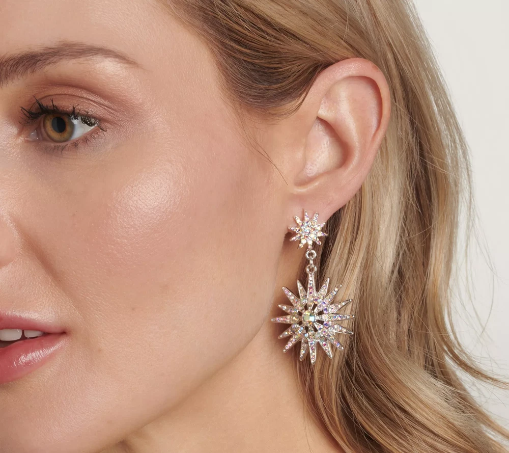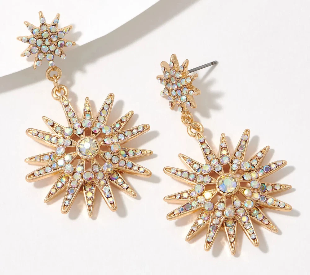 Brighten up the night with these starburst earrings featuring twinkling aurora borealis stones. From Kirks Folly. Starbursts encrusted with crystal aurora borealis stones; polished finish Butterfly clutch closures, for pierced ears only Measures approximately 1"W x 2"H Box Imported Gold tone PLated