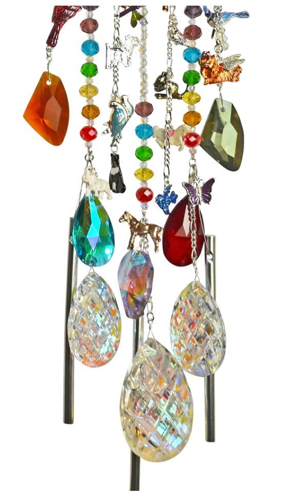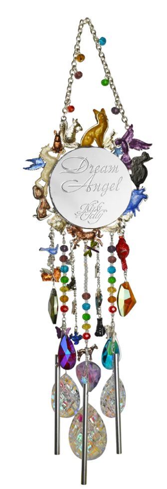 HEAR THE MUSIC OF THE CHIMES AND REMEMBER YOUR BELOVED PET! A collection of our beloved pets circle around a sleepy Dream Angel on the Rainbow Bridge Dream Angel Windchime. The angel is lulled to sleep wrapped in her feathered wings and as she sleeps she lets in only the good dreams. Crystals and chimes and more friends sway from below the Angel. She is guardian over all our friends on both sides of the bridge. Plated Sterling Silvertone. Measures approximately 5 ½" wide x 20" long.
