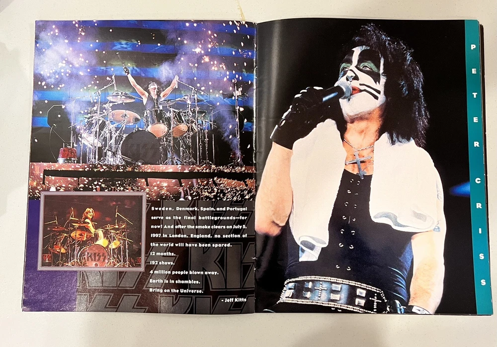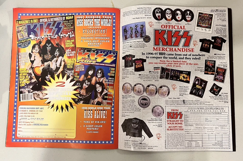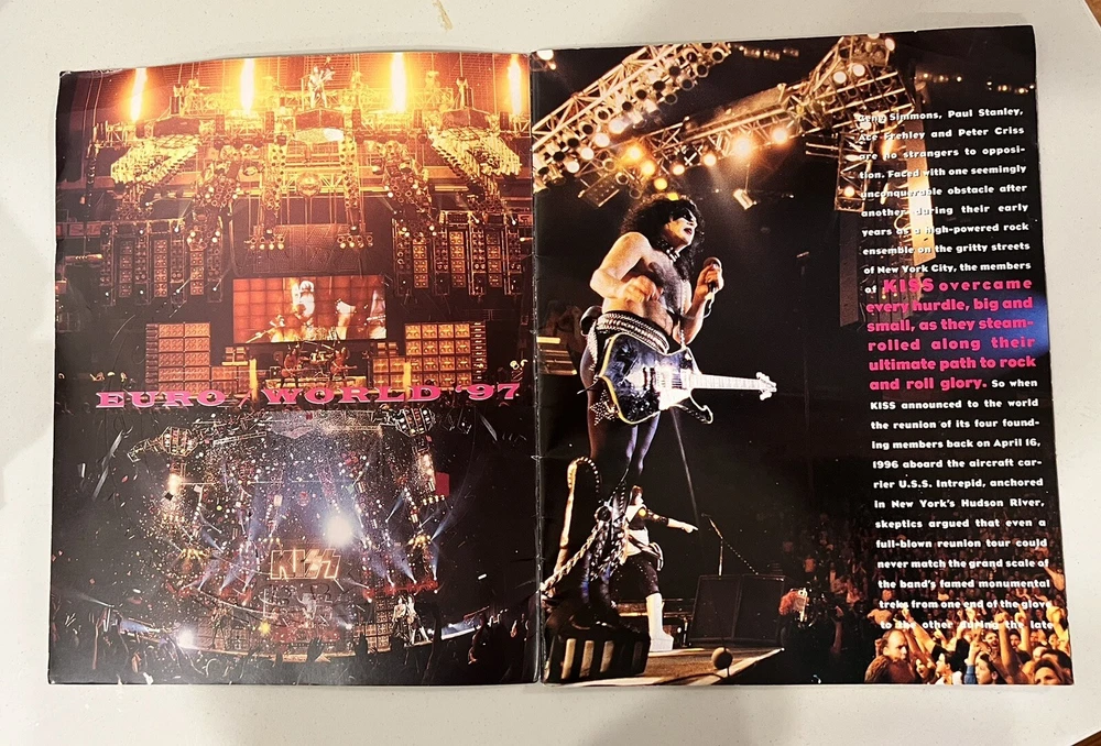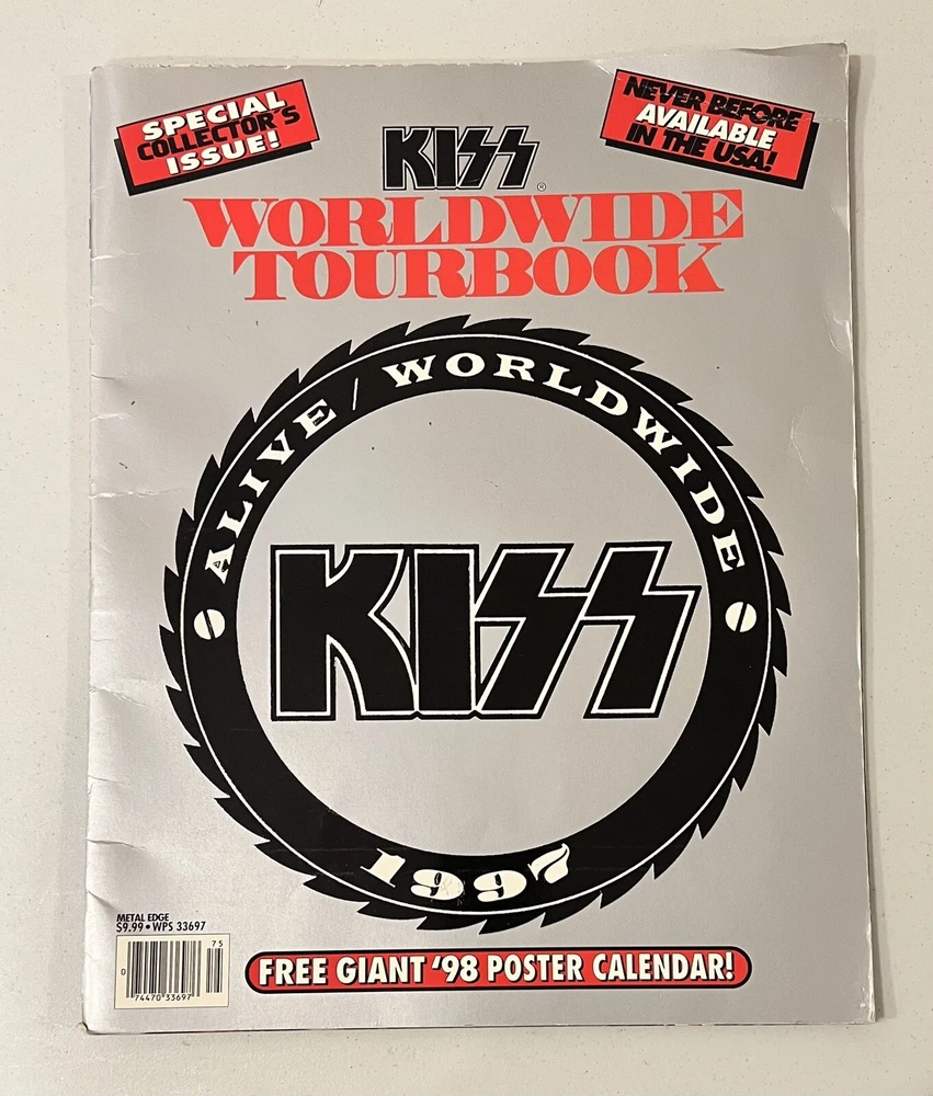Delve into the electrifying atmosphere of the KISS 1997 Alive Worldwide Tour with this special collector's issue program book. A must-have for fans, it's a treasury of rock and pop history, featuring vivid imagery and behind-the-scenes insights that offer a rare glimpse into the band's legendary shows. Proudly manufactured in the United States, this piece of music memorabilia is an homage to the iconic duo, placing it in the pantheon of cherished collectibles for enthusiasts of the genre. Whether you're a longtime follower or new to their legacy, this program book is an essential addition to your collection. The calendar has been removed. Other than that it looks complete. If you have any questions or would like additional photos please message me. Thanks