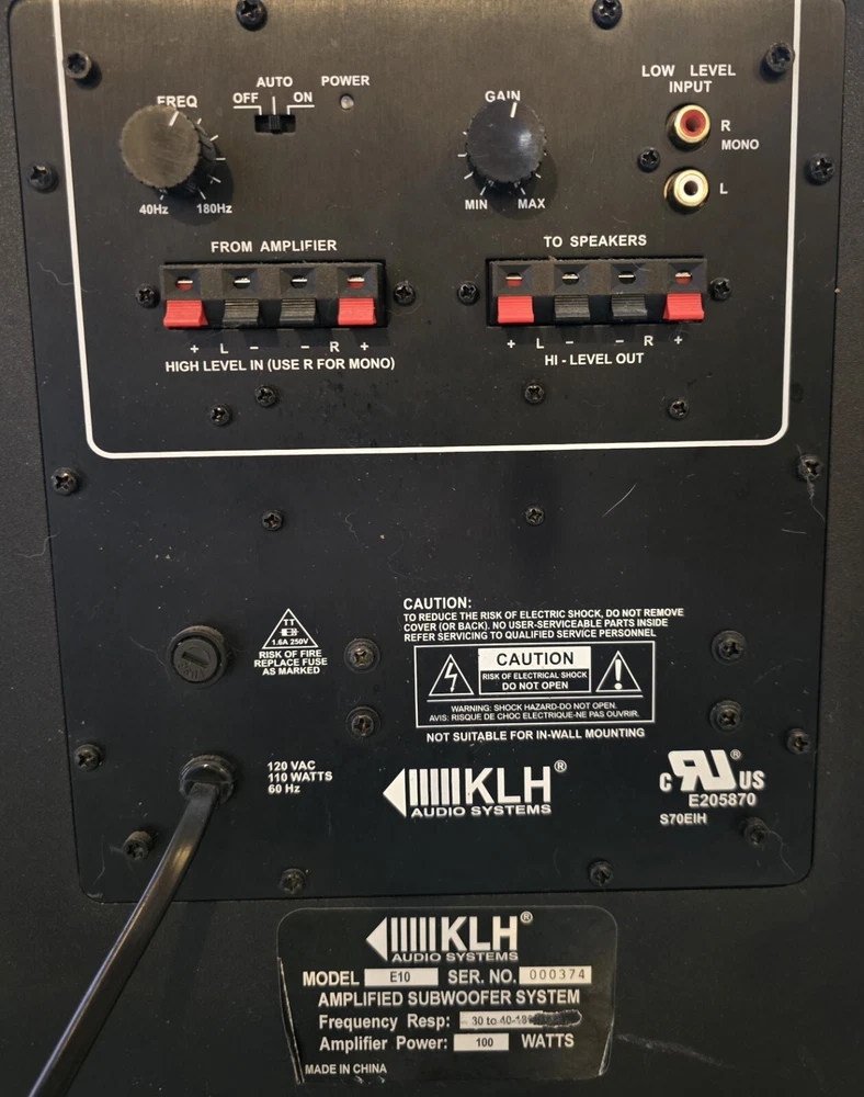 The KLH Audio Systems E10 Amplified Home Theater Powered Subwoofer is a high-end cube-shaped subwoofer that delivers 100 watts of powerful, deep bass for a home theater setup. With stereo L/R RCA audio inputs, this subwoofer is designed to enhance your audio experience with its sleek black design. The E10 is a wired subwoofer that boasts a premium build quality and is part of the KLH brand known for producing top-notch audio equipment. Perfect for adding rich, immersive sound to your home audio system.