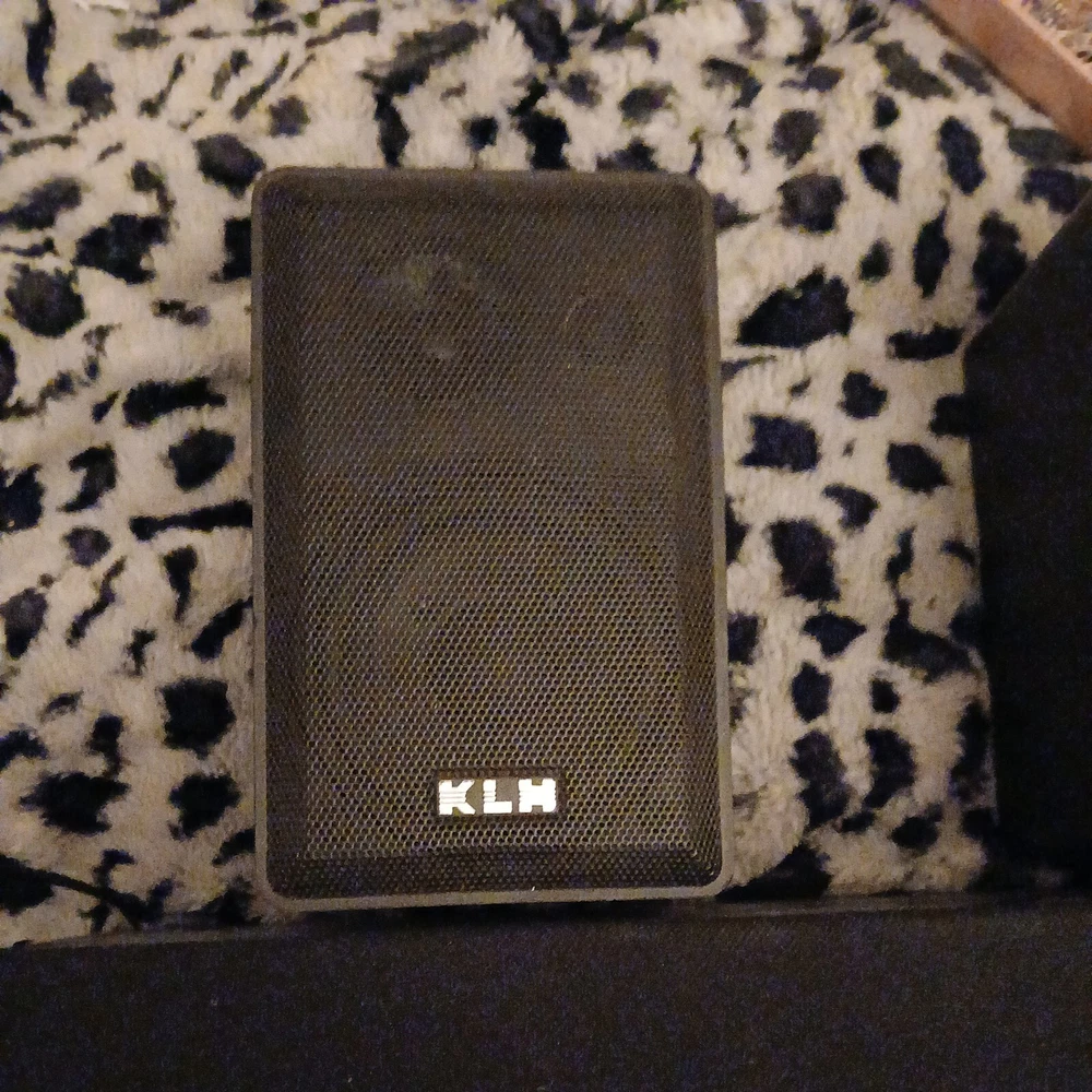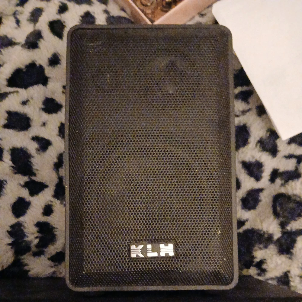 This is a KLH Dolby Pro Logic Speaker System Model #2410. It includes 2 rear and 1 center speakers with a rectangular shape, black metal construction, and high-fidelity sound quality. The speakers have Dolby Pro Logic surround sound format, bookshelf form factor, and wired connectivity with wire inputs. The center speaker has a power range of 5-50w and weighs 10.8 lbs.