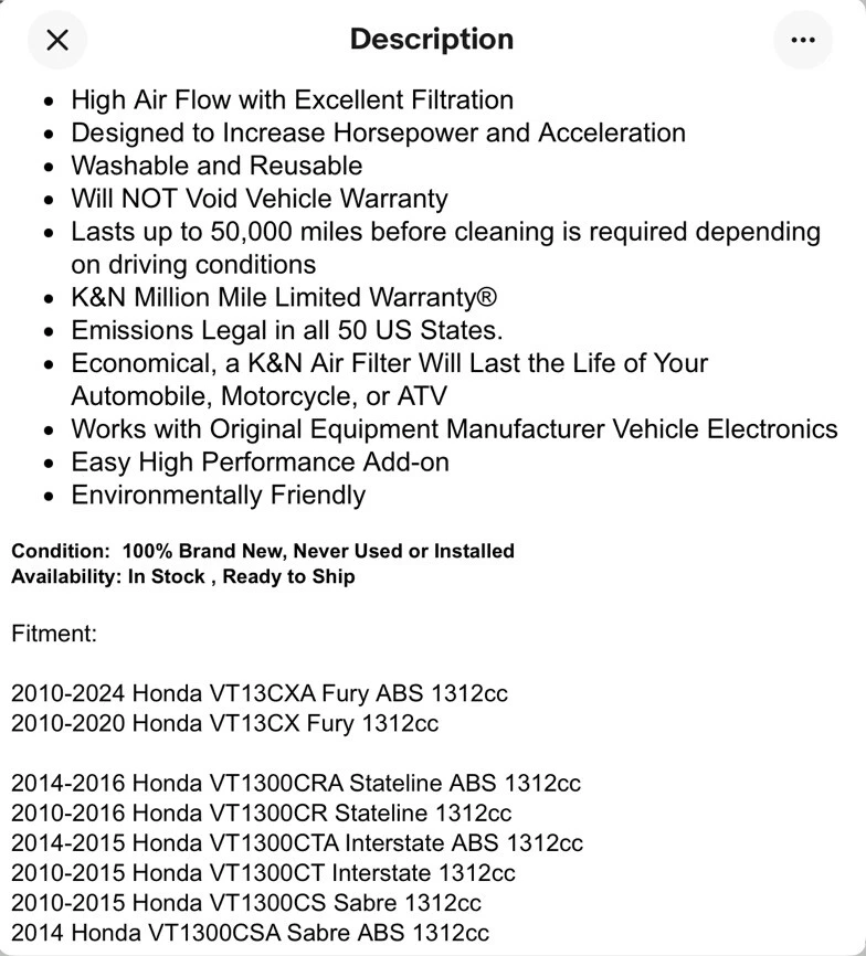 The K&N HA-1310 Hi-Flow Air Intake Filters are designed as a performance/custom upgrade for 2010-2024 Honda Fury motorcycles. These drop-in filters offer a direct replacement fitment and feature a high-flow design to improve air intake efficiency. Made by K&N in the United States, the filters have an OE Spec for improved performance, while being easy to install with no modifications required. The product is backed by an unspecified length warranty and is in stock for quick shipment within one business day. Check out my other items listed for Honda fury accessories. *** Only ships within the United States and not to Puerto Rico, Guam, us virgin islands, Northern Mariana Islands, or American Samoa.