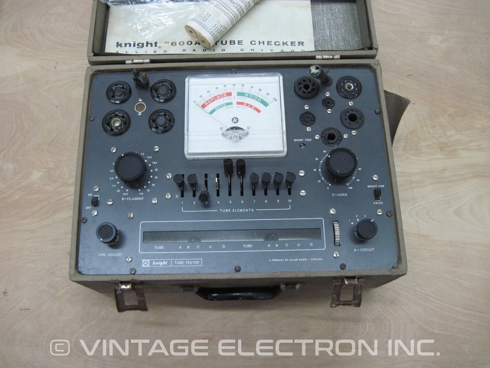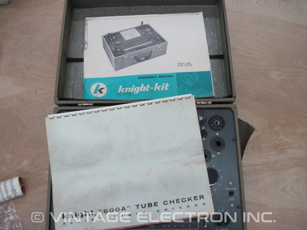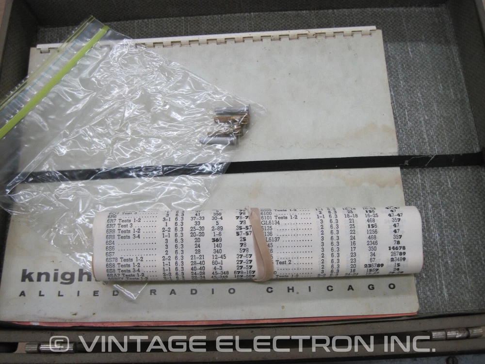 You are bidding on (1) used Knight-Kit KG-600A Tube Tester/Checker. This was part of the Knight-Kit line by Allied Radio. We tested for basic power on only and it powers on fine, no issues. Other than that, condition is unknown as far as the actual testing etc. We cannot guarantee accuracy, stability, or other functional goodness. The unit turned on, otherwise no other testing done, sold as-is. This is in fair condition, please study the photos as they form a part of the description. It is dirty/dusty/stained etc from age (see pics). Faceplate is actually in good condition, no major rust or scatches, etc, good shape (see pics). Note that the tube roll was missing, but we had a spare KG-600 roll that we are including. Could be a candidate for restoration or use for parts for your own unit that you are restoring. The wood cover has some split corner seams that need to be re-glued, and as shown the whole case could stand to be re-covered. Includes both manuals, however is missing one of the black button caps on the lever switches. As with all vintage equipment such as this, the unit should be gone thru to ensure it's functional and safe. Please study the photos as they form a part of the description. Thanks for looking at our listing and be sure to check out our other listings and auctions for other items of interest. Sold as-is, no returns. Shipping to US addresses via USPS Priority Mail or UPS Ground (if you choose UPS Ground, you must provide a street address, no PO Box). Vintage Electron Inc. possesses the largest inventory of NOS Dynaco parts available anywhere in the world, having purchased both the remaining warehouse inventory of the old Sound Values/Stereo Cost Cutters Inc. (SV/SCC) operation as well as the remaining inventory of the old Dynaco National Service Center. SV/SCC was the company that purchased nearly 250,000 pounds of Dynaco parts when Dynaco closed it’s doors back in 1979; they also purchased the existing Hafler inventory from the Rockford Fosgate Corporation back in the early 1990‘s. Quantities of some parts (both Dynaco and Hafler) are very limited as can be expected. Vintage Electron Inc. has no affiliation with the old SV/SCC company and we do not provide repair services at this time for any of the Sound Valves brand products. Please visit our store and search under the Dynaco section for additional Dynaco items, search under the Hafler section for Hafler items, and search under the Sound Valves section for Sound Valves items. Thanks for looking at our listing and be sure to check out our other listings and auctions for other items of interest. SPECIAL OFFER - FREE brand new VE Tube Pin Straightener (Made In USA) for all orders over $300!!! Works with 7 pin miniature, 9 pin miniature, 10 pin miniature, Magnoval, Novar, and Compactron tubes. Also available for individual sale, please visit our store and search for Tube Pin Straightener.
