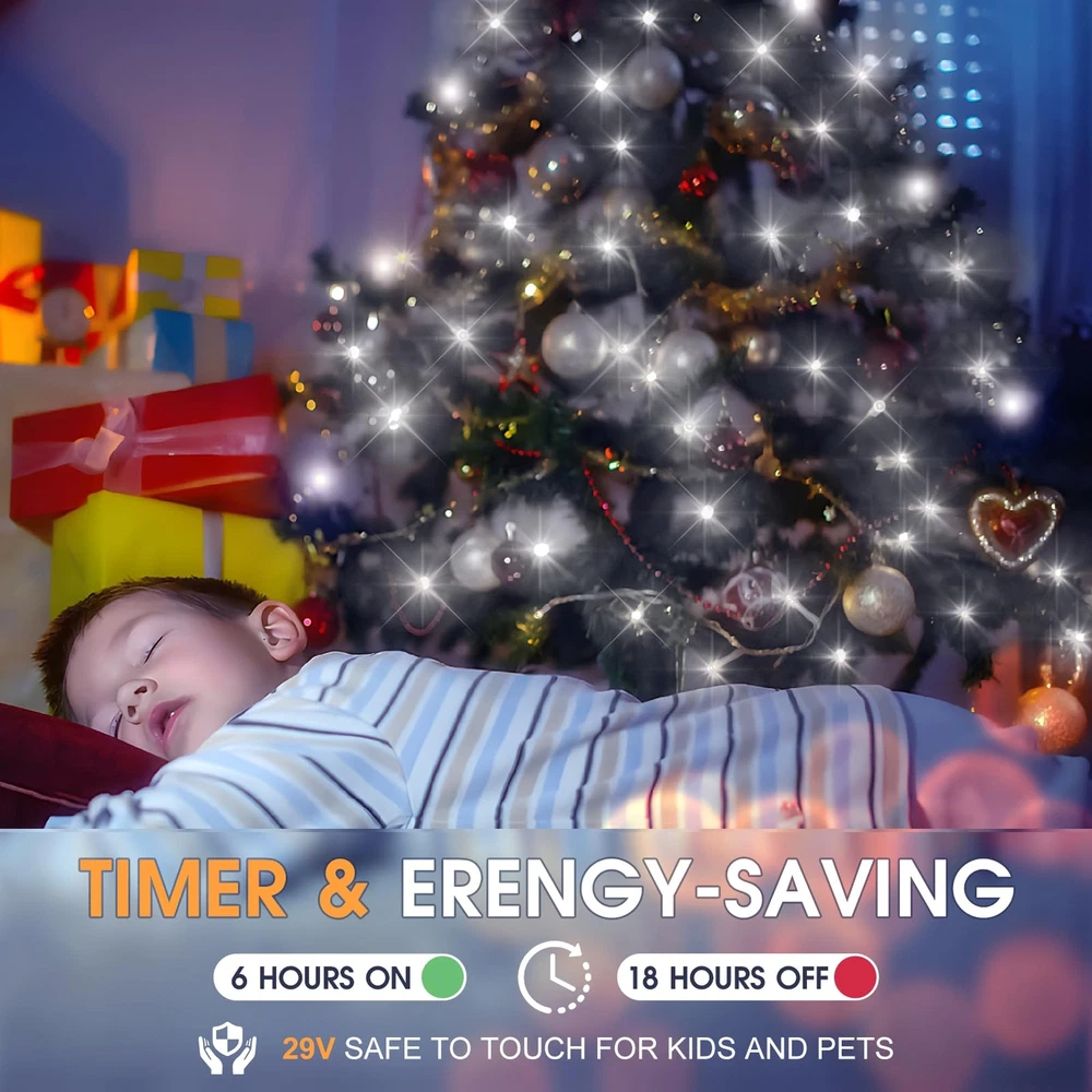 600FT Super Long and 1500LEDs Super Bright: The Green Wire 600ft Christmas lights with 1500LEDs beads, and 9.84ft plug cord, which can be enough to wrap around and decorate a 15ft Christmas tree, no need to extend, moreover green wire will blend well with the tree. Upgraded higher brightness and non-dazzling LED bulbs to create a cozy, romantic and festive atmosphere for Christmas, Wedding or Family Dinners. As a holiday decoration, KNONEW Christmas string lights is really Excellent Value. Smart Christmas String Lights: Including 1 steady on +7 Variable Lighting Modes(Combination/In Waves/Sequential/Slo-Glo/Chasing/Slow Fade/Flash/Steady On). Stay away from single lighting mode! Whether you are hosting a lively gathering or enjoying a quiet evening under the stars, variable Lighting Modes allows you to set the perfect mood for any occasion. Safer and More Efficient: Christmas LED Lights is powered by 29V low voltage output Plug with UL certified, and Low-temp LED bulbs ensure no overheat after long time using. Very safety for kids and pets even can hold it or hang it on their bodies. The LED beads not only do they consume a fraction of the energy , but they also boast a longer lifespan, saving your both energy and money in the long run. It's a win-win situation that combines eco-friendliness with cost-effectiveness. Indoor Outdoor Used: Outdoor lights have IP44 waterproof rated, you can trust they hold up against stormy days, and provide reliable performance season after season. Kindly note the plug needs to be protected from water. Perfect for indoor and outdoor use, hang it into your yard,garden,patio,bushes,doorways,and bedroom,classroom,curtain,ceiling. Making you feel relaxed after exhausting work all day,and enjoy the peaceful moments at night. 4 Adjustable Brightness Levels and 3 Timer Function: Built-in timing and memory chip, no longer have to manually turn it on and off every day, and it will save your last mode setting or timer setting without reset. Saving your time. 100%-75%-50%-25% 4 level brightness adjustable, you can choose the brightness that makes you feel most comfortable. Super easy to install, plug-in and play, then hang it or place it anywhere you need. It`s a great gift for your family and friends.