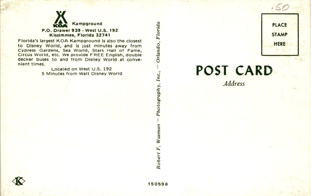The postcard advertises the X Luxury Kampground X, a KOA Kampground located in Kissimmee, Florida. It is highlighted as Florida's largest KOA Kampground and is conveniently close to popular attractions like Disney World, Cypress Gardens, Sea World, Stars Hall of Fame, and Circus World.
