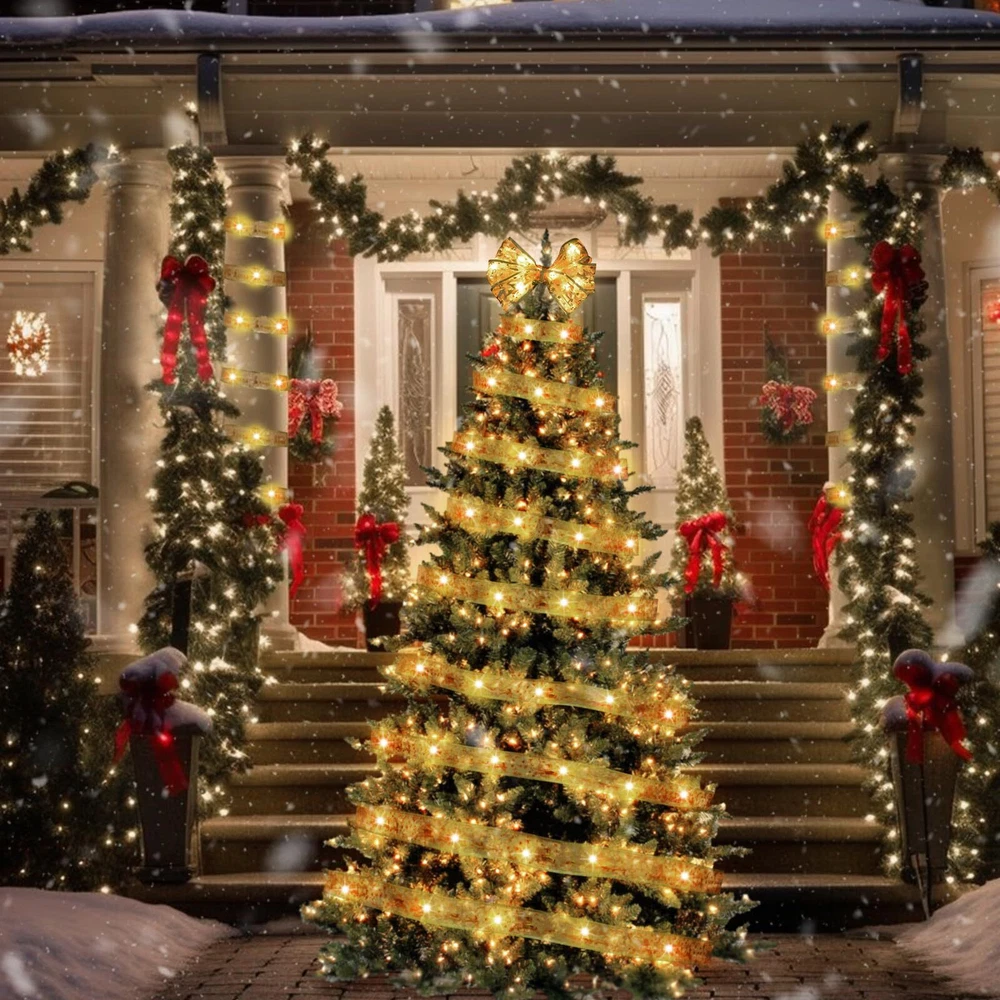 Ribbon Fairy Lights for Xmas Tree Decorations: The 2" by 32Ft Christmas tree ribbon light will creat a romantic atmosphere. Each lights have 100 LEDs and the electric wire about 20" that can help you hide wire and battery boxes Battery Powered/USB Charge: The ribbon fairy lights are not only use battery, but we also design with a USB can be powered with a mobile power bank, providing ultimate portability and convenience for both indoor and outdoor use 8-Lighting Modes: The tree lights contains 8-lighting modes includ combination, in waves, sequential, slog-glo, chasing, slow fad, twinkle, steady-on. Different modes offer different visual enjoyment Timer Function: The Christmas tree decoration have timer function(6 hours ON, 18 hours OFF). You can set timer function avoid forgetting to turn them off and save energy Christmas Tree Ribbon Bow Lights: Double-deck cloth with gold santa and deer pantern printed and gold edge are great decorations for your Christmas tree, yard, garden, room, ladder, wedding, and party