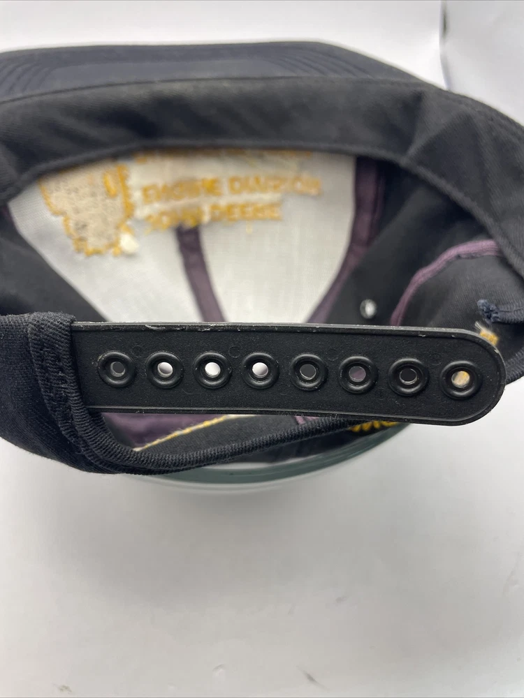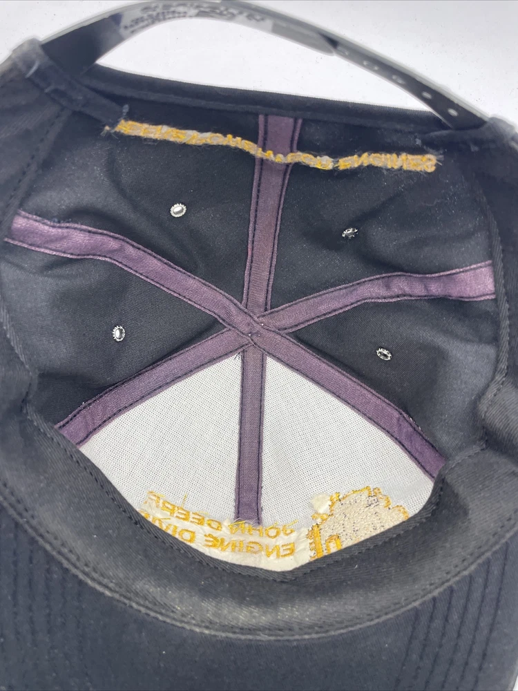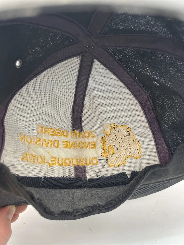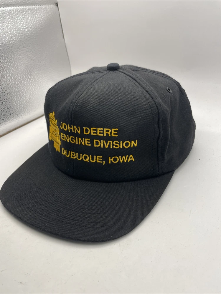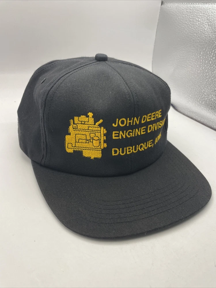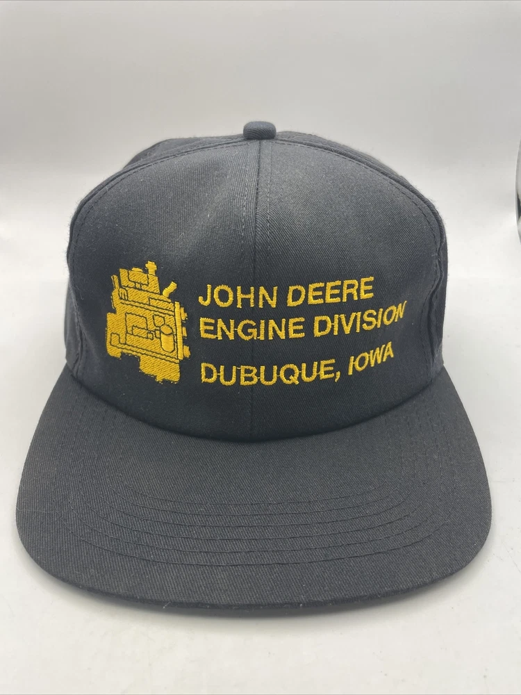 This K-Products John Deere Engine Division Dubuque, IA Made In The USA SnapBack is perfect for any fan of the iconic American brand. This vintage snapback features adjustable sizing, making it comfortable for anyone to wear. The black hat with “Engine Division Dubuque, IA" text is a must-have for any collector or enthusiast. The hat's blue-collar theme and one-size-fits-all design make it a great gift for a hardworking man. This snapback is ideal for everyday wear, whether it's for work or leisure. Add it to your collection today and show off your love for John Deere with this stylish accessory. The hat is in used condition and has minor signs of ware as pictured such as marks to the liner.