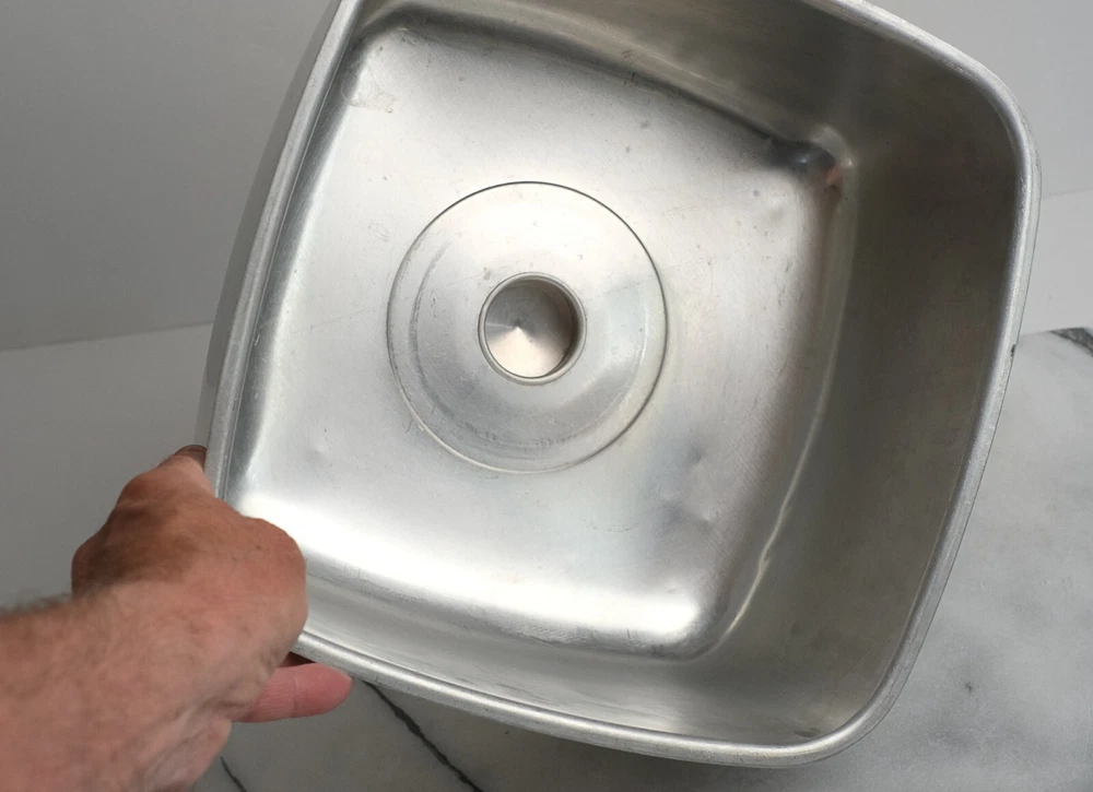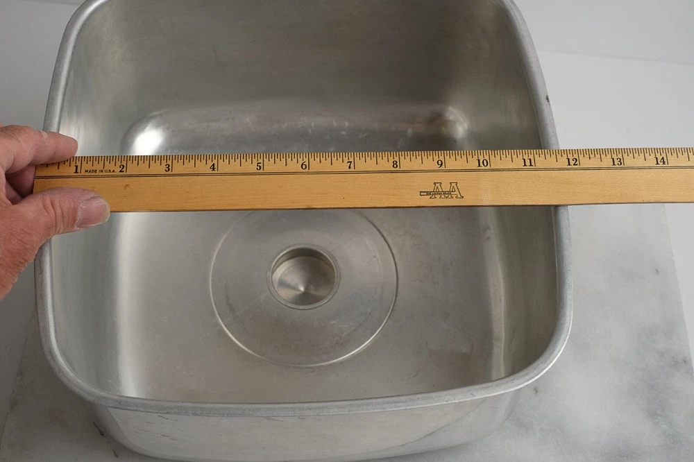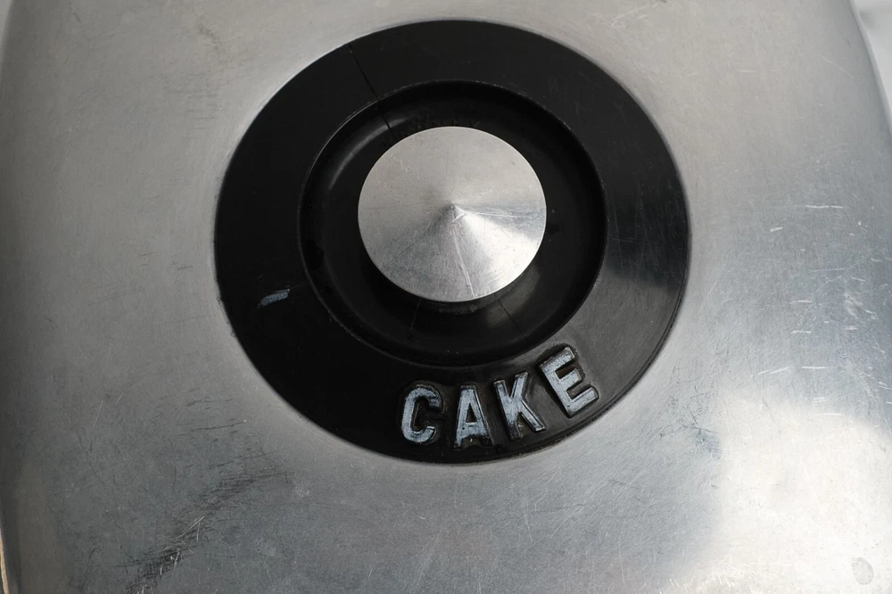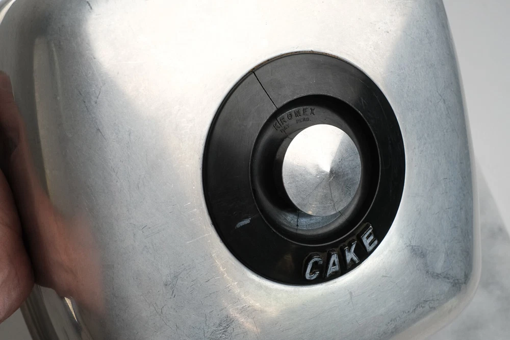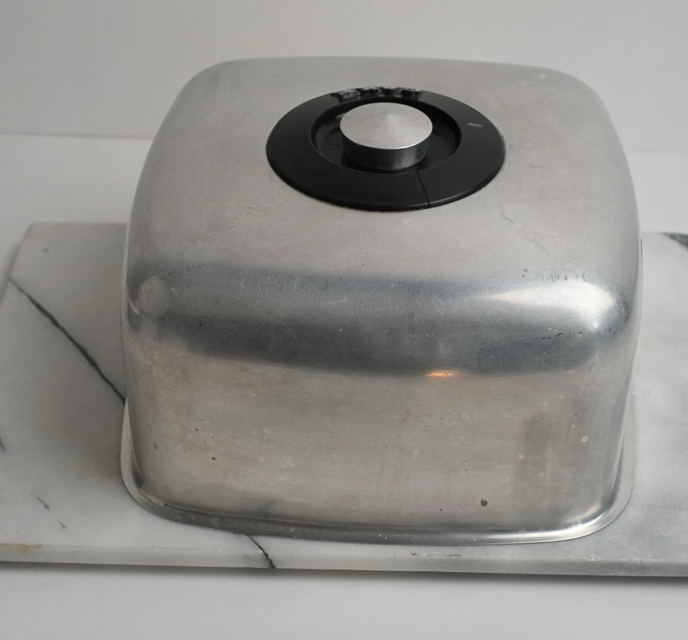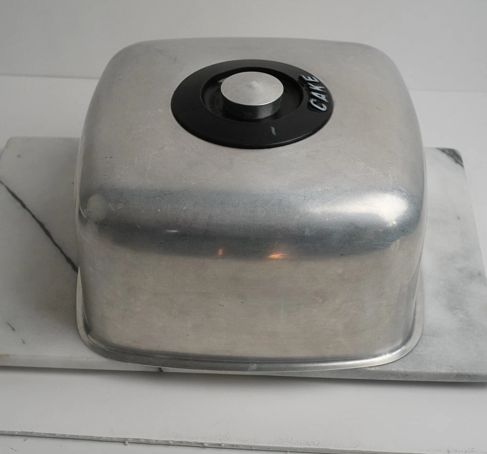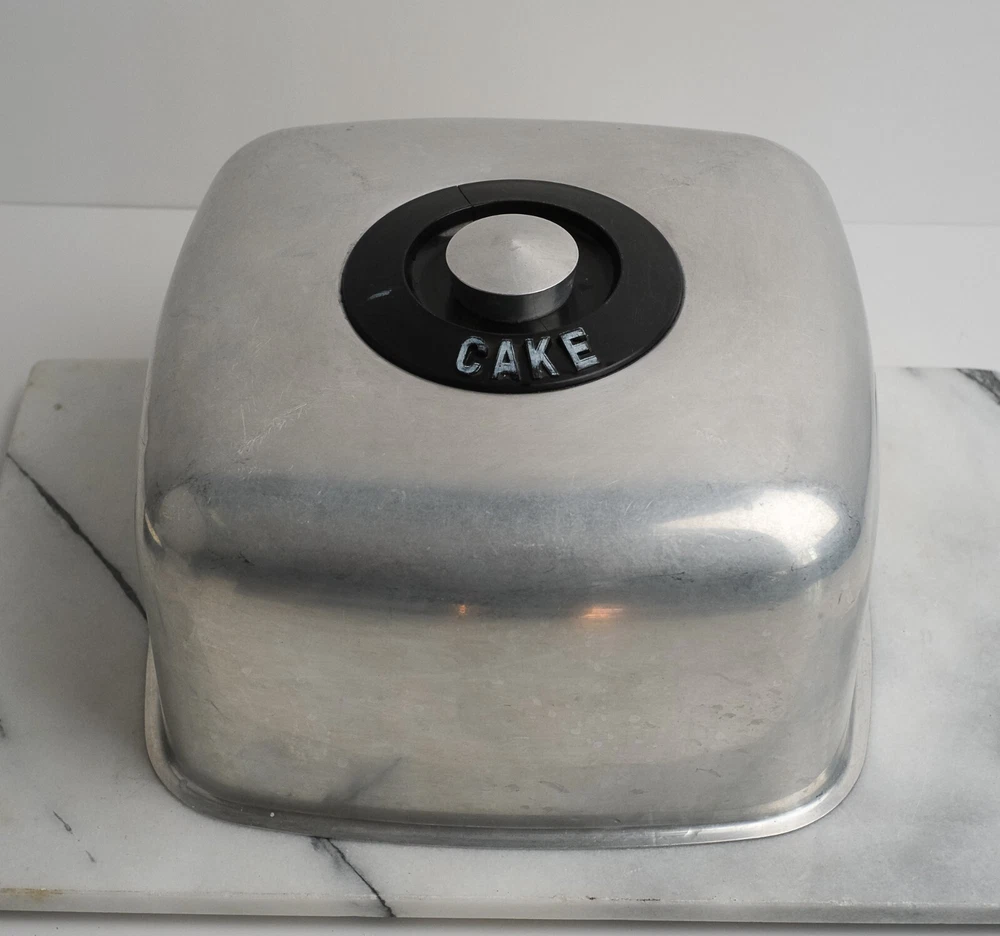 KROMEX Cake Cover Only Square Brushed Aluminum 11.5” Wide Vintage Cake Cover Only (no bottom plate/dish) made by Kromex USA Made of brushed aluminum Features black accents and features “CAKE” text on top near knob Clean and in vintage condition with typical bumps scratches and wear consistent with its age Square shape Measures 11.5” wide by 6” tall Black plastic accent has a crack on the top plastic but is not loose and still solidly attached to cover **** See photos for more details. Please note that we take the time to clean our items as much as possible before posting. We also provide hi-resolution & high-quality photos so you can better see what you are actually purchasing. (2678) Thanks for visiting O’Sullivan’s Attic. Be sure to see the other treasures we have for sale!