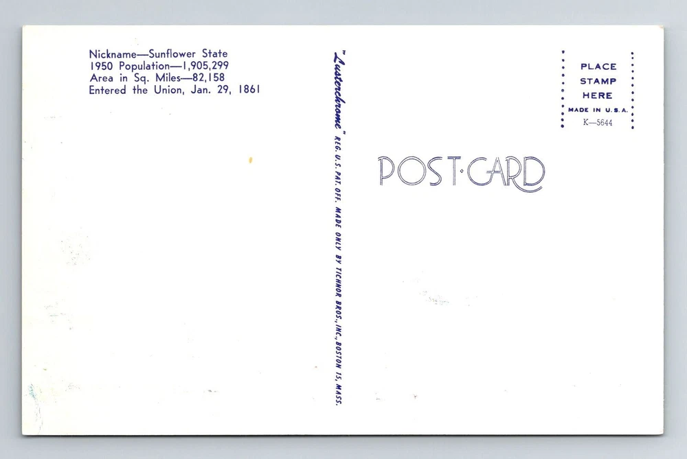 Unit of Sale: Single Unit Postage Condition: See Image Subject: Cities & Towns Theme: Cities & Towns Region: Kansas Country: USA Era: Chrome Original/Licensed Reprint: Original Country/Region of Manufacture: Unknown Type: Printed (Lithograph) City: Kansas