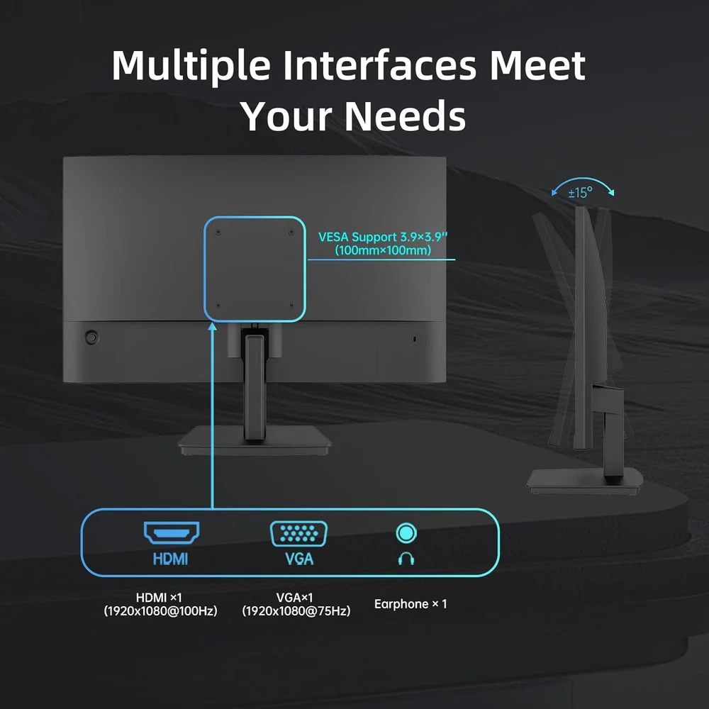 BRAND NEW! Feel free to message me with any questions. [Multifunctional Applications] 24" Full HD (1920 x 1080) computer monitor with FreeSync premium,perfect for everyday computing, home and office use, and gaming,catering to diverse user needs. [Game Ready] Fast 100Hz refresh rate, 300 Nits brightness,104% sRGB color gamut coverage, delivers a smooth, fluid, true-to-life picture. [Adjustable Viewing Angle] Tiltable from -5° to 15°,VESA mounting compliant (100 x 100mm), to adapt to different environments and use cases,effortlessly adjust to your preferred angle for maximum comfort. [Immersive Screen] Three-sided ZeroFrame bezels design provides immersive viewing.1 HDMI1.4,1 VGA ports and 1 Earphone Jack. [Low Blue Light] Eye-Care PC gaming monitor reduce the blue light to protect you from eye fatigue, irritation and strains.
