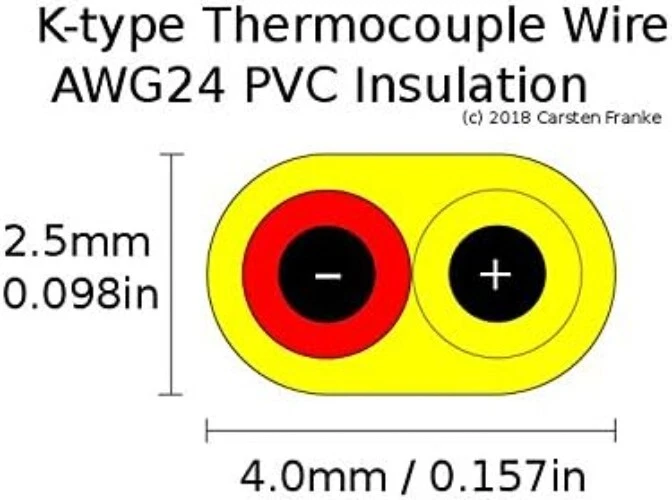 K-Type Thermocouple Wire AWG 24 Solid w. PVC Insulation - 50 Yard roll K-type Thermocouple wire with yellow vinyl insulation for making thermocouple or extension wire Chromel / Alumel type K thermocouple wire with Standard Accuracy (whichever is greater): +/- or +/- .75% Single strand wire, AWG 24 ( mm) ANSI color coded PVC insulation, red = -, yellow = + Sold in 50 yard roll, 1 unit = 50 yard, order 2 units and you receive 2 rolls 50 yard each This is a k-type thermocouple wire with yellow PVC insulation, which is good up to about 105 C or 221 F. When this wire is used as extension wire, it can transmit the temperature signal over the full type K range, from -320 to +2500 degree k-type thermocouple wire can be used to make your own thermocouples for a wide range of applications, or to make your own extension wire. The chromel alumel wire is made to standard thermocouple specifications. It is sold in 50 yard (150 ft) rolls, so if you order 2 units of this, you will receive 2 rolls, each 50 yard long. Look for a different listing to find this in 10 yard, 100 yard or 220 yard rolls.