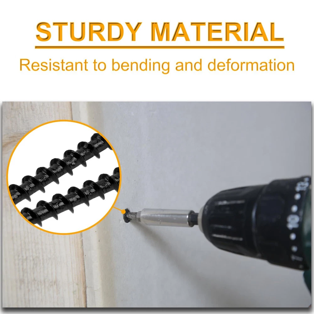 Flat Head screws drywall wall anchor screw kit wood dry set assortment hollow door mount mounting bolts drilling hardware metal picture self Tapping Drilling sheetrock shelf black repair assorted bookcase fix hang MATERIAL OF THE HIGHEST GRADE - The #6 * 1-5/8in drywall screws assortment kits are constructed of brand new material of the highest possible quality, which has an exceptional degree of brittleness. The surface has been galvanised and phosphated, which provides exceptional protection against rust and a fast and efficient self-tapping speed. REDUCE THE LIKELIHOOD OF WOOD SPLITTING - The Drywall Screws Set, featuring coarse threads, minimizes the risk of wood splitting when fastening gypsum board to wood or joining wood to wood. CLEAR AND WELL-ORGANIZED CONTAINER INCLUDED - The #6 * 1-5/8in Black Sheetrock Screws assorted kit comes with a well-built clear storage container that keeps the Sheetrock Screws clearly arranged so that you can get what you need at a glance when you're using. VERSATILE APPLICATION - The drywall screw set is your reliable companion for various projects, such as gypsum board and wood installations. With its dependable quality and durability, you can work with confidence.