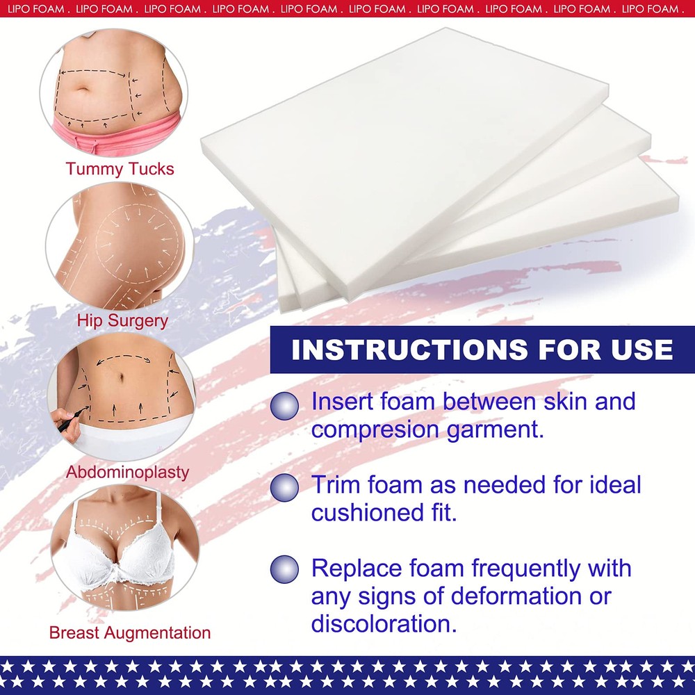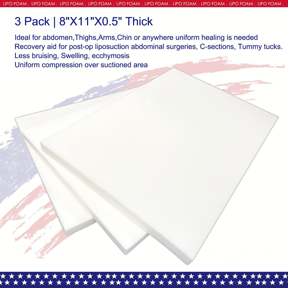 A MUST FOR YOUR RECOVERY - Lipo foam pads works by offering comprehensive compression over the healing zone and ensuring equal pressure for improved comfort and faster healing. Lipo foams are an essential post op recovery aid for anyone who has undergone liposuction and abdominal surgeries such as tummy tucks and C-sections. Size 8" X 11" X 0.5" inch. LIPOSUCTION FOAM - Compression lipo foam sheets designs to help with recovery after plastic surgery procedures such as abdominal and waist liposuction, BBL, 360 lipo abdominoplasty (tummy tuck), arms and thighs liposuction, coolsculpting, smart lipo, Brazilian butt lift, liposculpture, C-section, vaser. SUPER SOFT & EASILY CURVED: Our post surgery lipo foam is made of high quality polyurethane foam, which is super soft and easily curved to fit you perfectly, help to create a soft barrier between compression garments and sensitive skin. Foam can be easily trimmed to desired size and shape. CONTROL SWELLING & IMPROVE DISCOMFORT: Our lipo compression AB board foam is fundamental in helping controlling swelling, bruising and also with contouring by preventing wrinkling of the skin and enhancing skin retraction.With the use of lipo foam sheets, you will feel and see a difference in your pain, discomfort and results. THE IDEAL COMPLEMENT FOR YOU: These Surgery Ab Boards are used after a cellulite reduction, tummy tuck, hip surgery, abdominoplasty, knee surgery, panniculectomy, liposuction, breast augmentation and more.They can be used under any medical compression garments, recovery suit, assets shapewear bodysuit, girdle, bra, bandeau, belt, or other post surgery clothing.